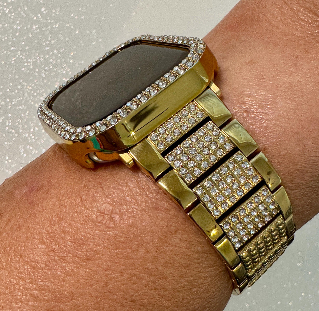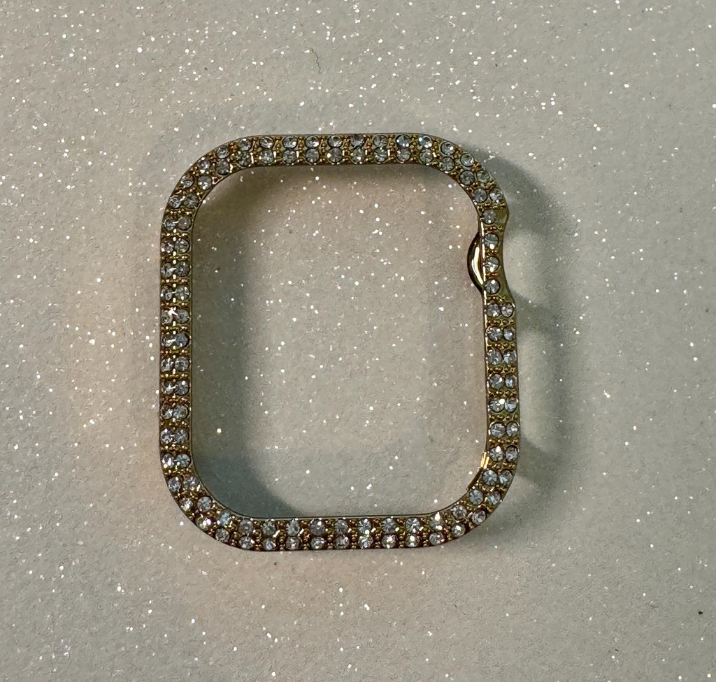 And or the apple watch cover with 2 rows of large High End Swarovski Crystals set in a 14k gold metallic plating poly carbonate hard frame. Easy snap on case that resists daily wear and tear with access to all buttons. This apple watch case has no screen protector and is not made of metal.