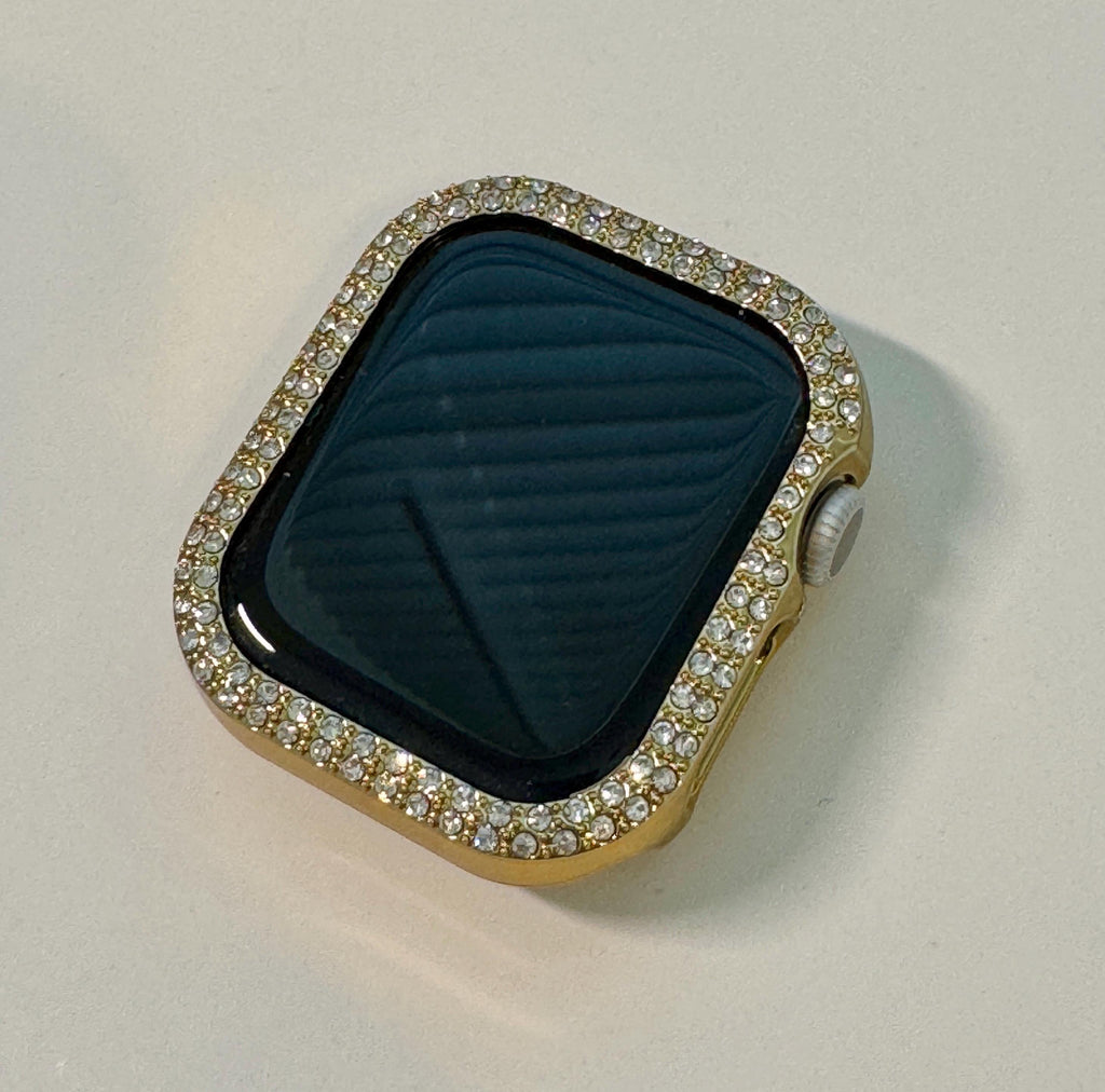 Apple Watch Case Materials: Gold Metallic Poly Carbonate case with 2 rows of hand set Swarovski Crystals. There is NO screen protector and it is not made of metal.