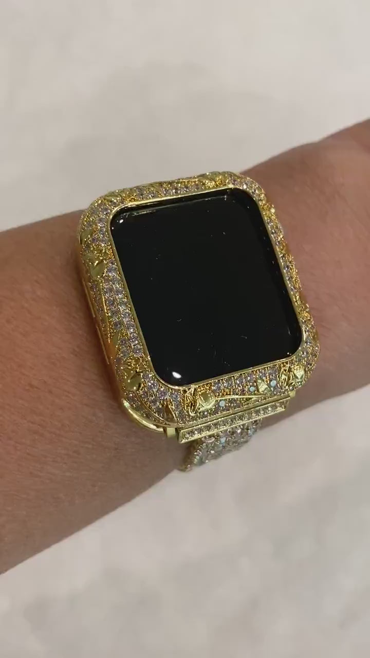 Add a Gold Metal Apple Watch Case Bezel with hand set high quality High End Crystals with pretty floral design. Fits easily over your watch. Once watch straps are attached it holds the bezel in place. Watchband must be attached for this bezel to fit properly. Due to the style with no bars on the back it will fit looser than the style with 2 bars.