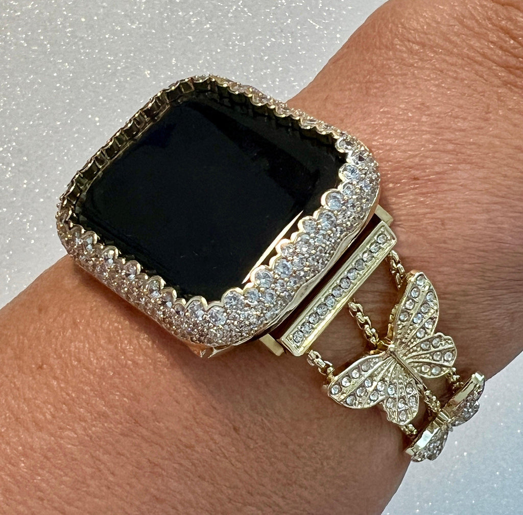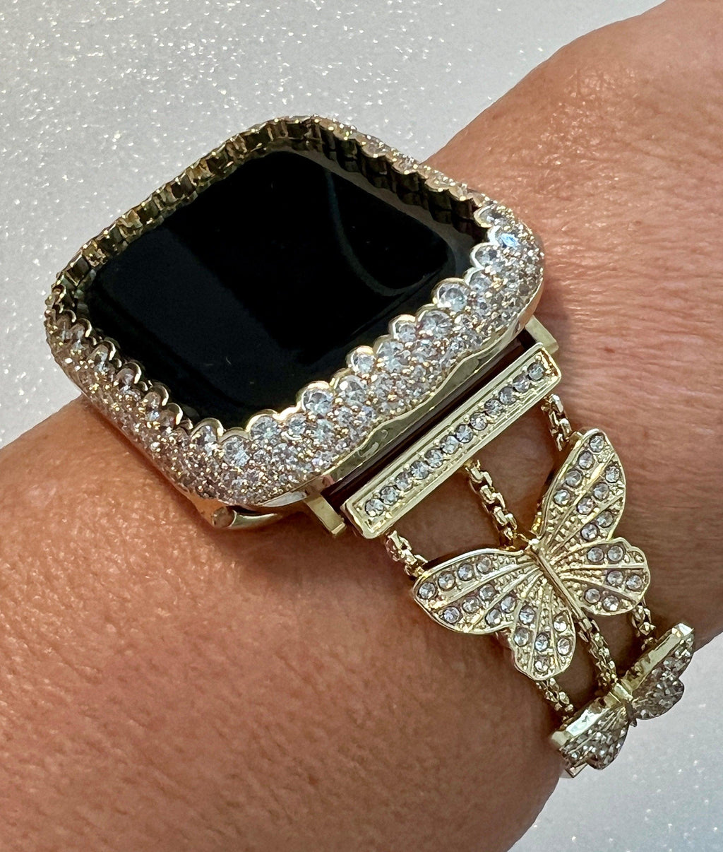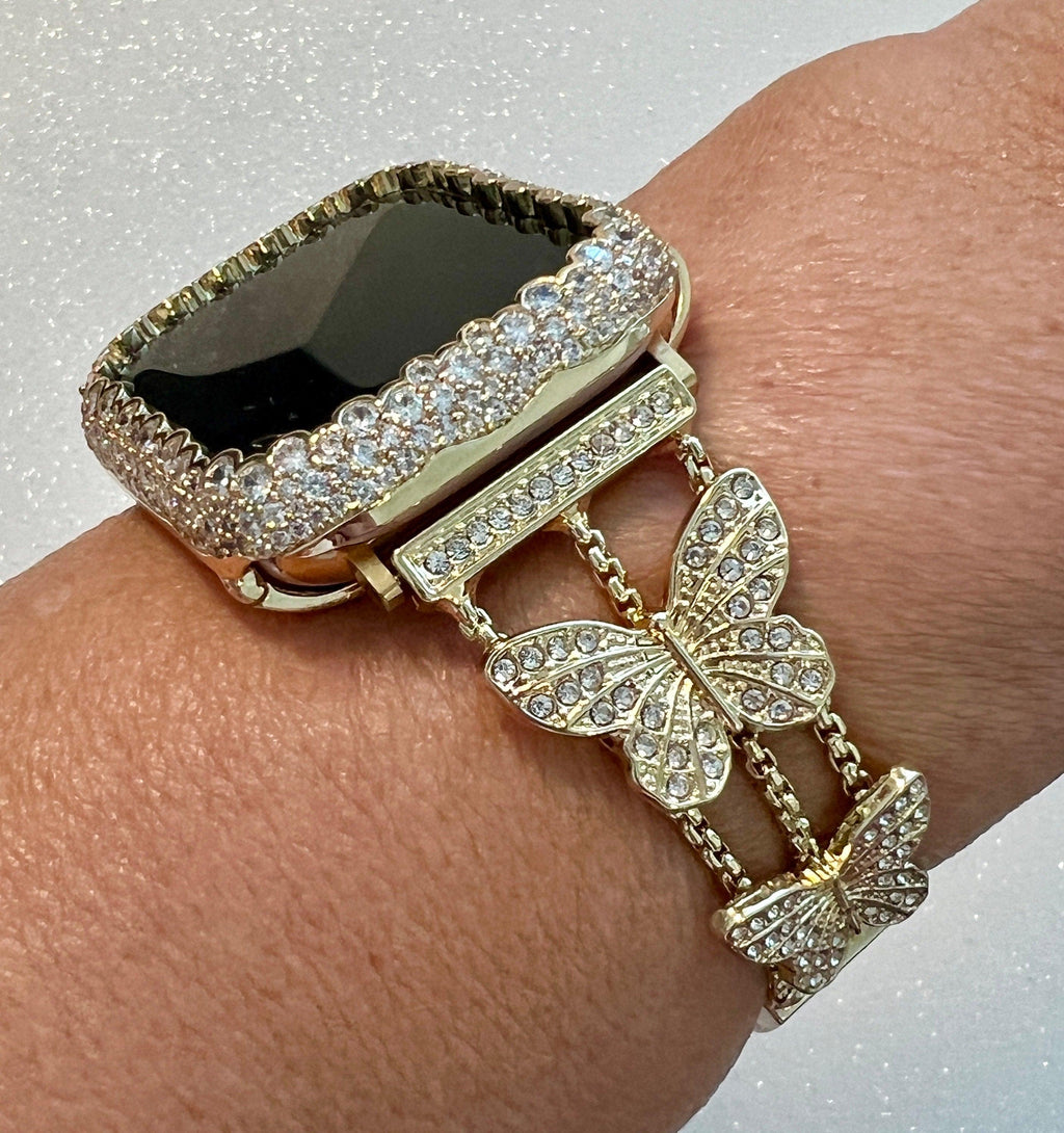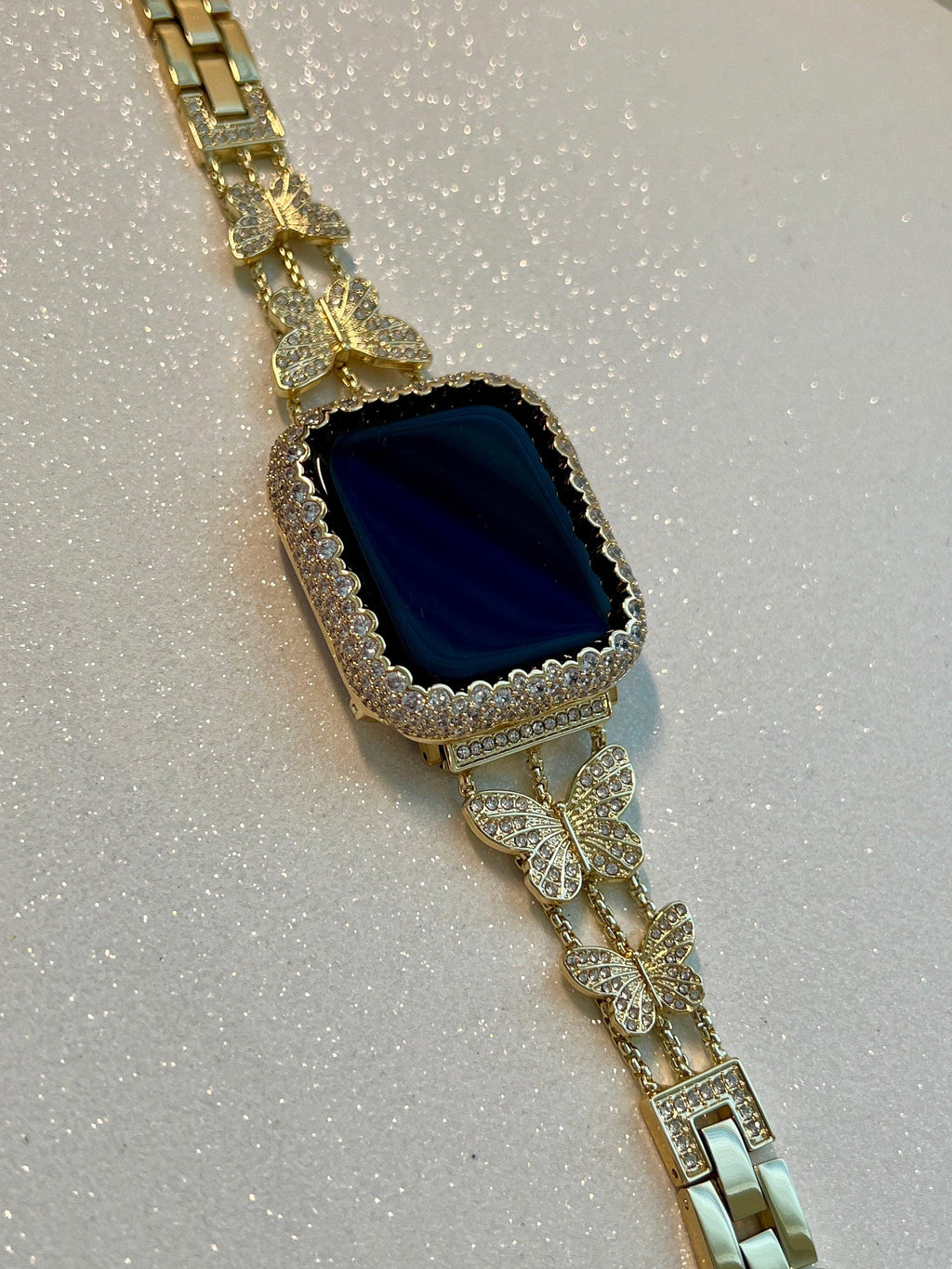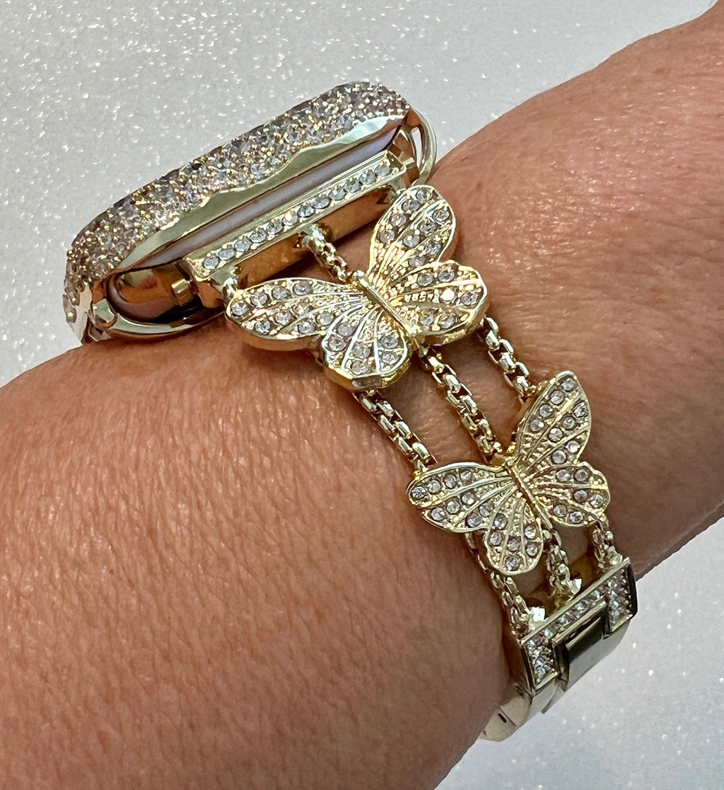 This designer Apple Watch band features beautiful butterflies with High End crystals, set in a durable and shiny yellow gold alloy. You can choose to purchase the band only, the watch case only, or as a set.