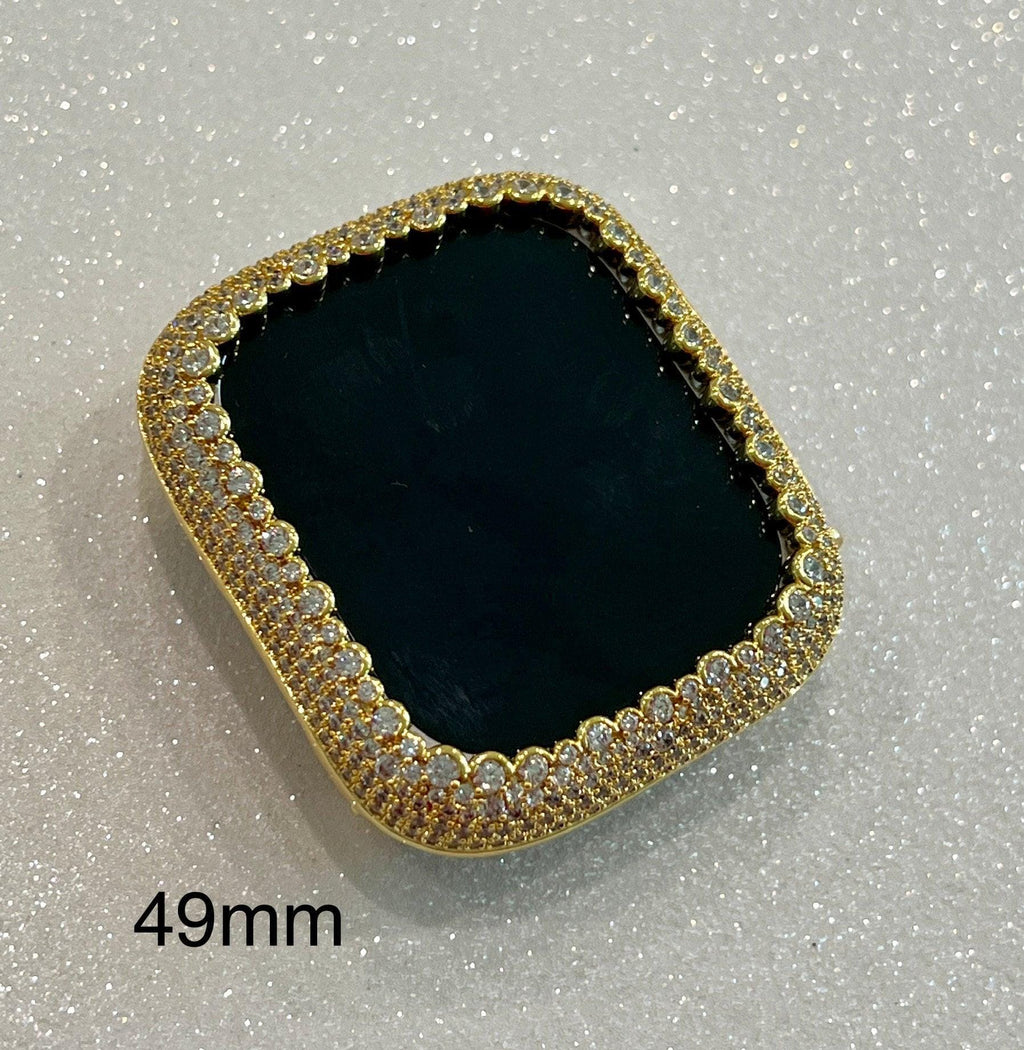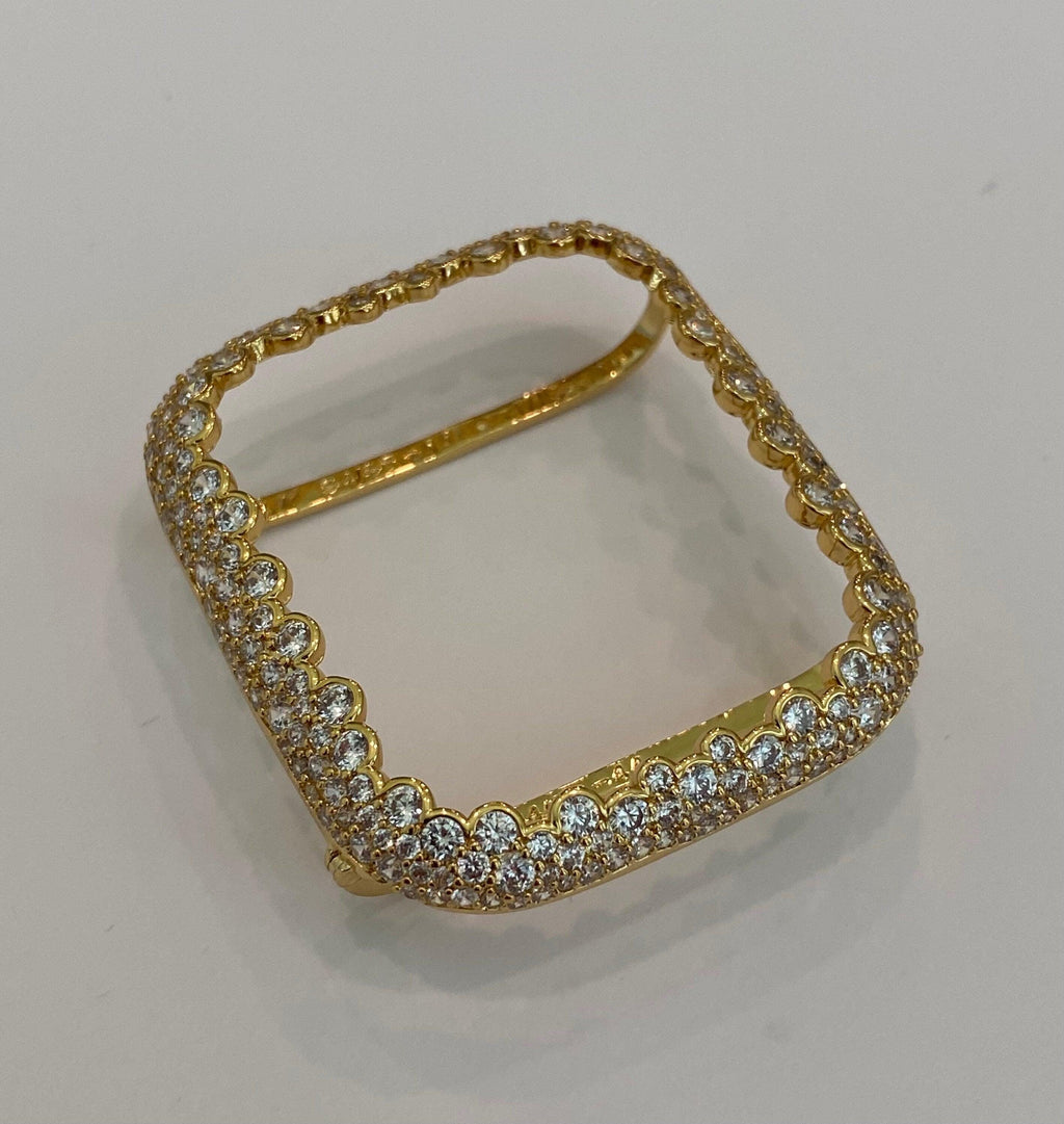 For added glamour, consider adding our Gold Apple Watch Cover. It features a custom 14k yellow gold-plated bezel with high-quality micro pave lab diamonds, which are securely hand-set. The cover has two bars on the back to hold the Apple Watch case in place and provides access to all buttons without the need for a screen protector. (Please note that the Apple Watch is not included and is used for photo purposes only.)
