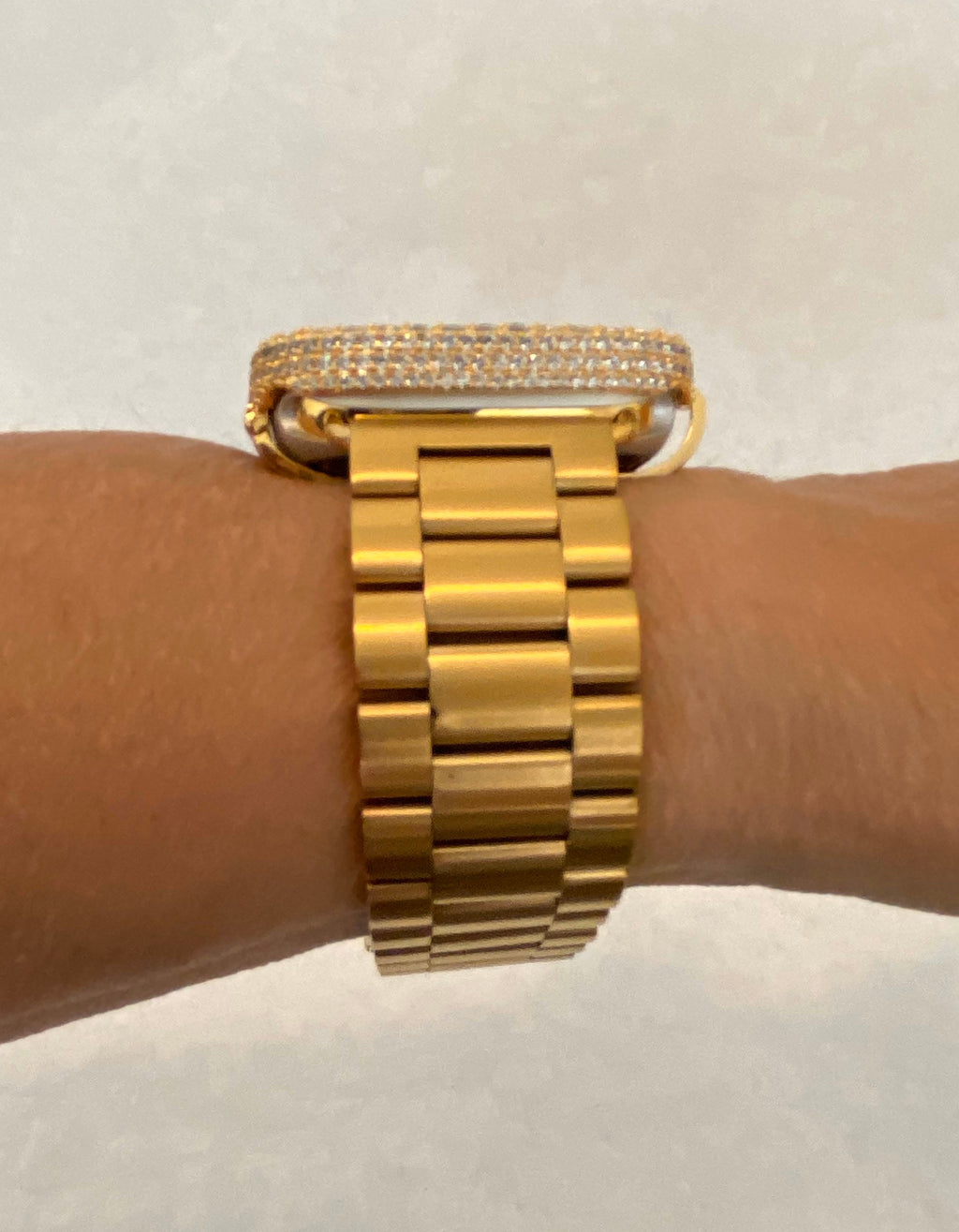 This band is specifically designed to Fitsthe Apple Watch available for sizes 38mm 40mm 41mm 42mm 44mm 45mm 46mm Series 2-11 SE Ultra 1/2/3 Men's & Women's. This is a custom design made to fit the Apple Watch, it is not a brand copy. Watch Band Gold Women's Men's in a Link Style Band. Iwatch Band Premium Stainless Steel Butterfly Buckle Style. Iwatch Candy Bling for your Apple Watch