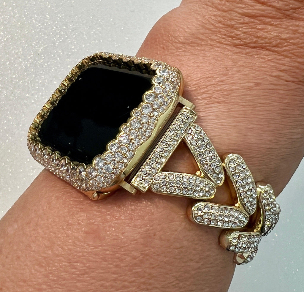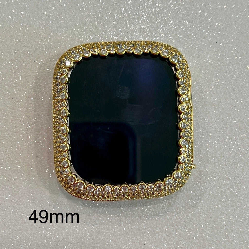 For the ultimate in sparkle, add the Yellow gold Apple Watch Case in 14K Gold Plated Metal with hand set high quality Pave Lab Diamonds. This apple watch cover has two bars on the back to hold the apple watch in place with access to all buttons, no screen protector.