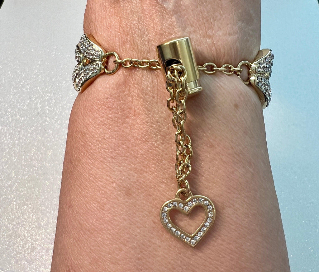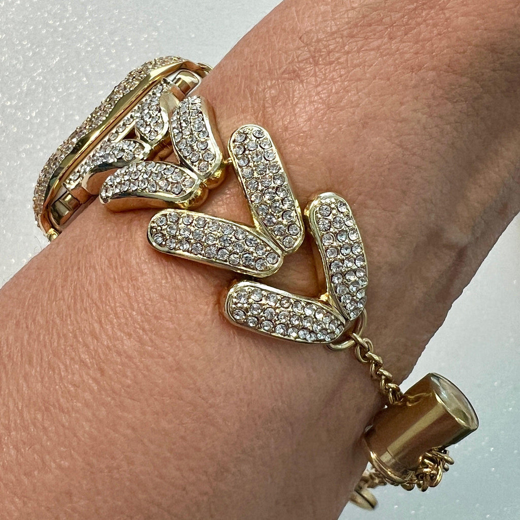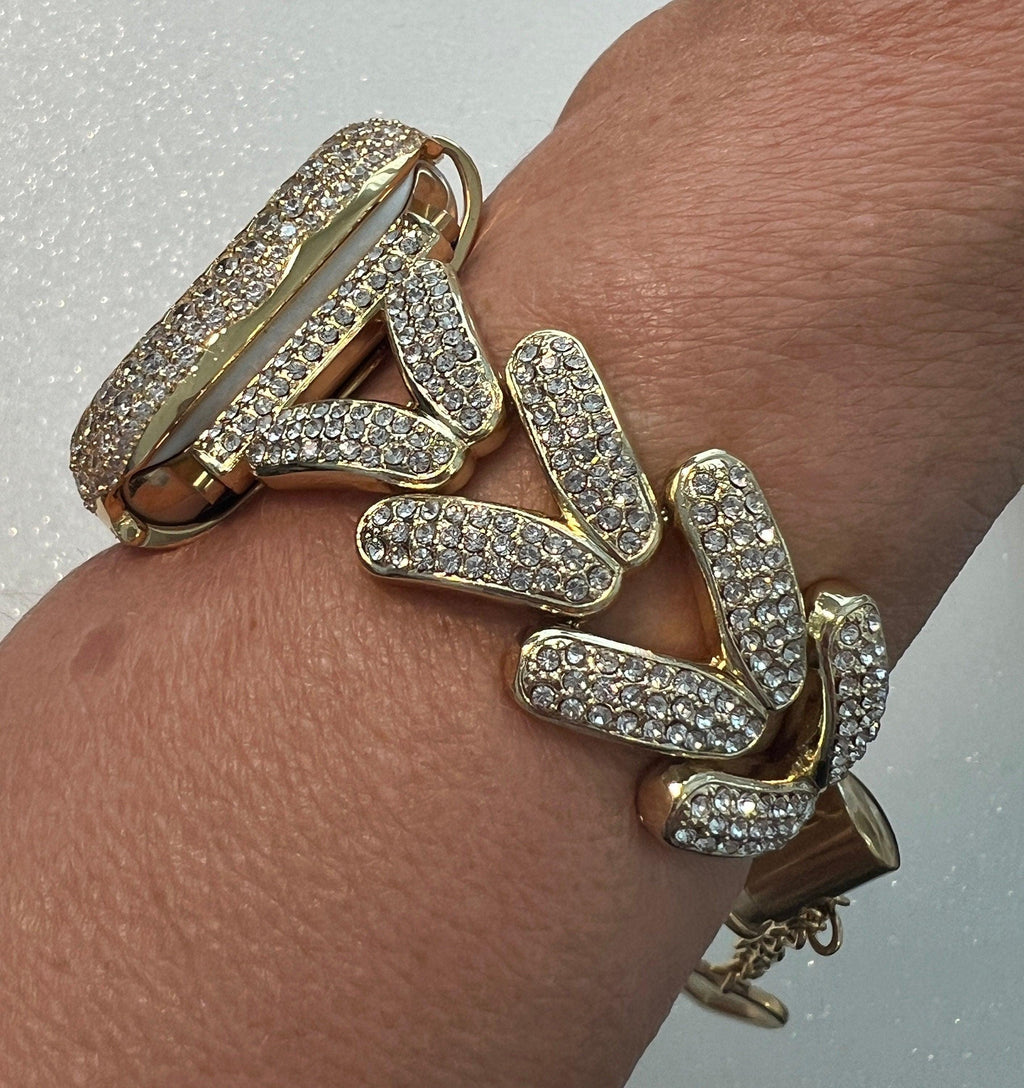 Fits Apple Watch in sizes 38mm 40mm 42mm 41mm 44mm 45mm 46mm Series 2-11 SE. 49mm Ultra 1/2/3 (design slightly different for 49mm please refer to photo). This apple watch band is a custom design made to fit the Apple Watch, it is not a brand copy. This Apple Watch band has High Quality High End Swarovski Crystals set in gold alloy plating with a pretty crystal heart dangling at the end of the chain. You can purchase this luxury Apple Watch Band or Apple Watch Case as a set or separately.