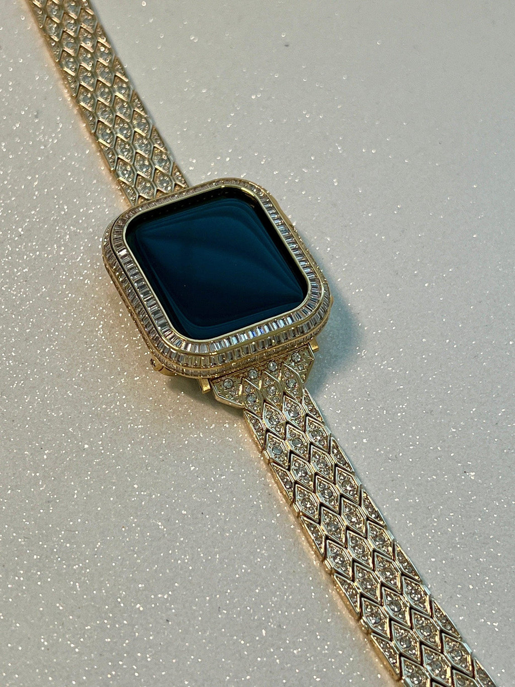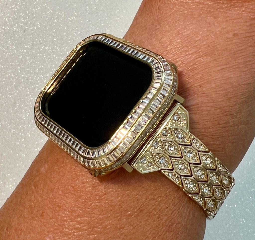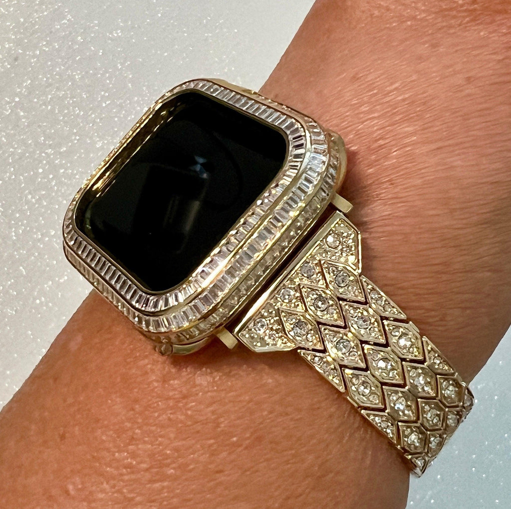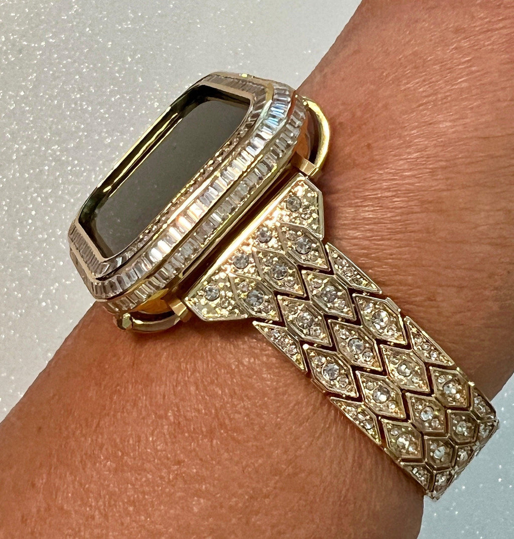Fits the Apple Watch in sizes 38mm 40mm 41mm 42mm 44mm 45mm 49mm Ultra 1-2 Series 2-9 SE. This is a custom Iwatch Candy Apple Watch Band in Yellow Gold set with High End Crystal in a luxury Gold Alloy Metal with fold over clasp/closure. The sparkle on this apple watch band is amazing in a diamond pattern. Can be adjusted to fit wrist sizes from 5.5" to 8". Please measure your wrist before purchasing as we do not sell or provide extra links. Easy to resize and comes with a tool/instructions. You can select the set band+bezel, band only or bezel cover only using the drop down menus.