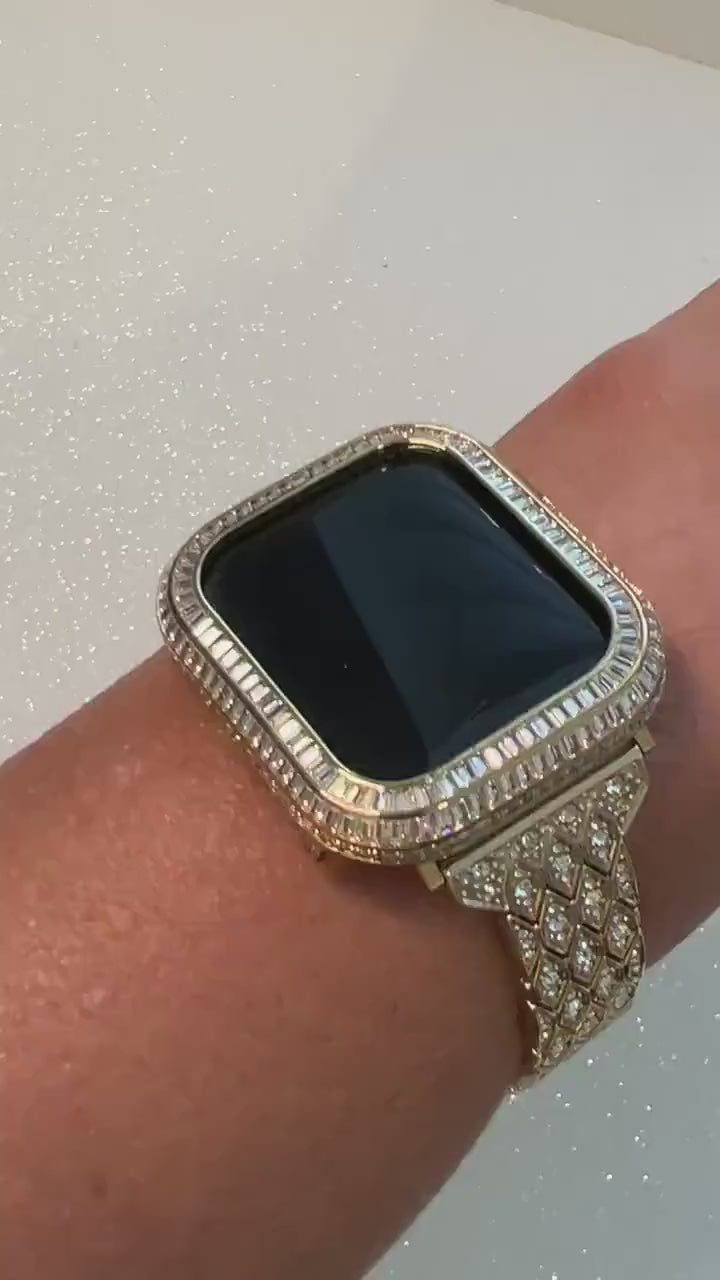 For the ultimate in sparkle, add the Yellow Apple Watch Case in 14K Gold Plated Metal with hand set with 3 rows of high quality baguette Lab Diamonds. This apple watch cover has two bars on the back to hold the apple watch in place with access to all buttons, no screen protector.
