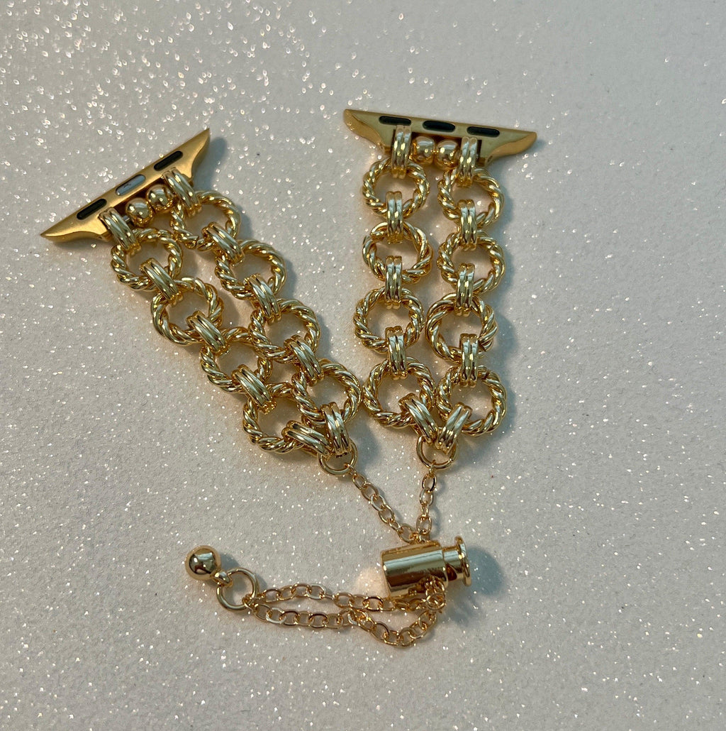 Fits the Apple Watch available for sizes 38mm 40mm 41mm 42mm 44mm 45mm 46mm Series 2-11 SE Ultra 1/2/3 Men's & Women's. Customize your Apple Watch with this Iphone Watch Band with Round Twisted Oval Links set in Stainless Steel for extra durablility and shine. The band has a toggle chain closure. Can be adjusted to fit wrist sizes from 5.75" to 8". Please measure your wrist before purchasing to ensure it's a good fit.
