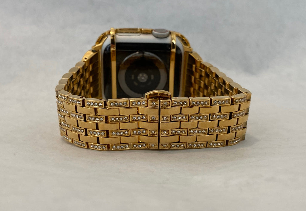 Apple Watch Band Material: Yellow Gold Stainless Steel for durability and shine with hand set pave Swarovski Crystals Elements