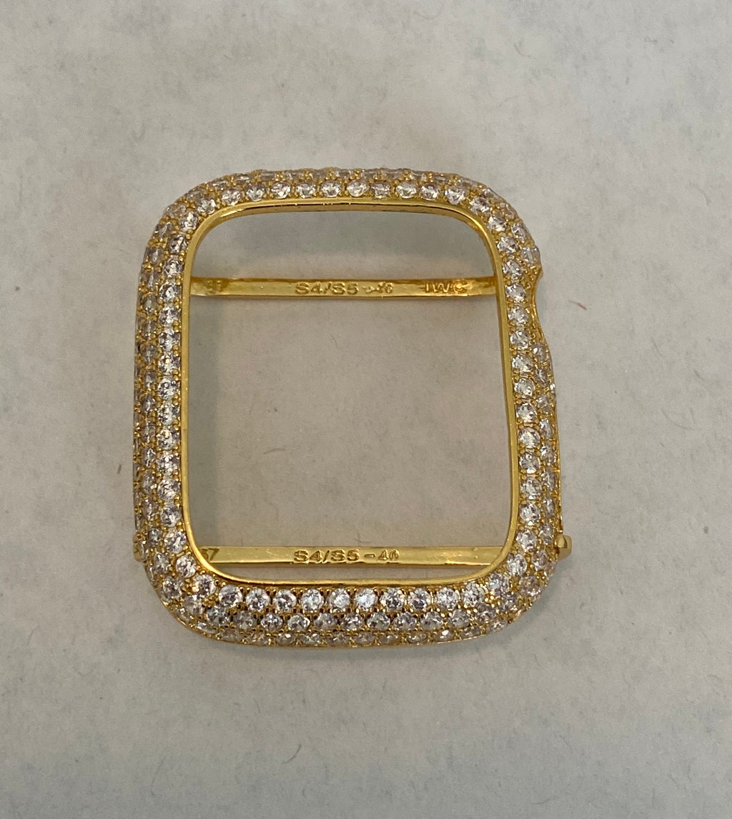 Apple Watch Case Materials: 14kt yellow gold plating over a metal base with hand set pave lab created diamonds. Two bars on the back hold the Apple Watch in place with access to all buttons. There is NO screen protector. Instructions Included.