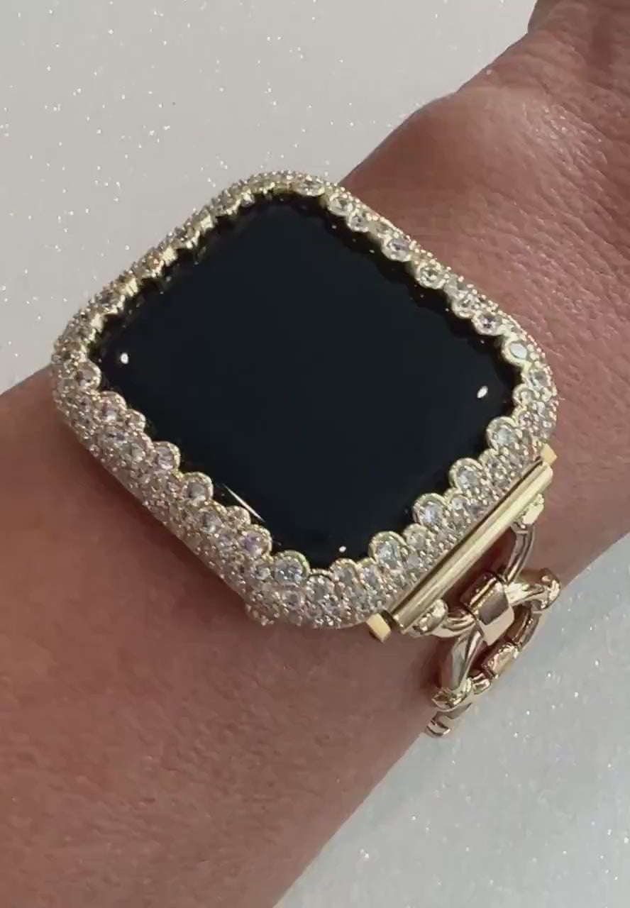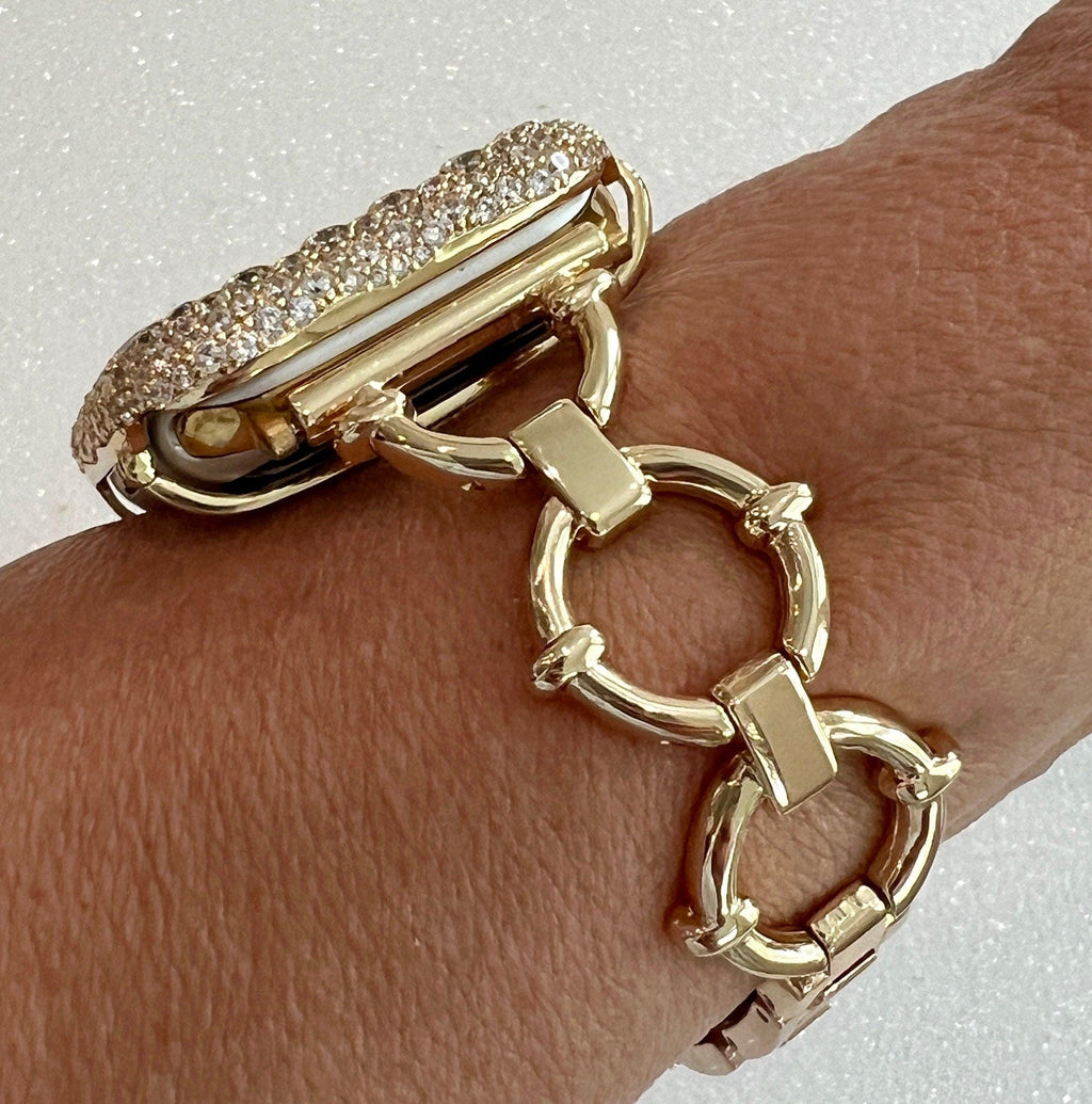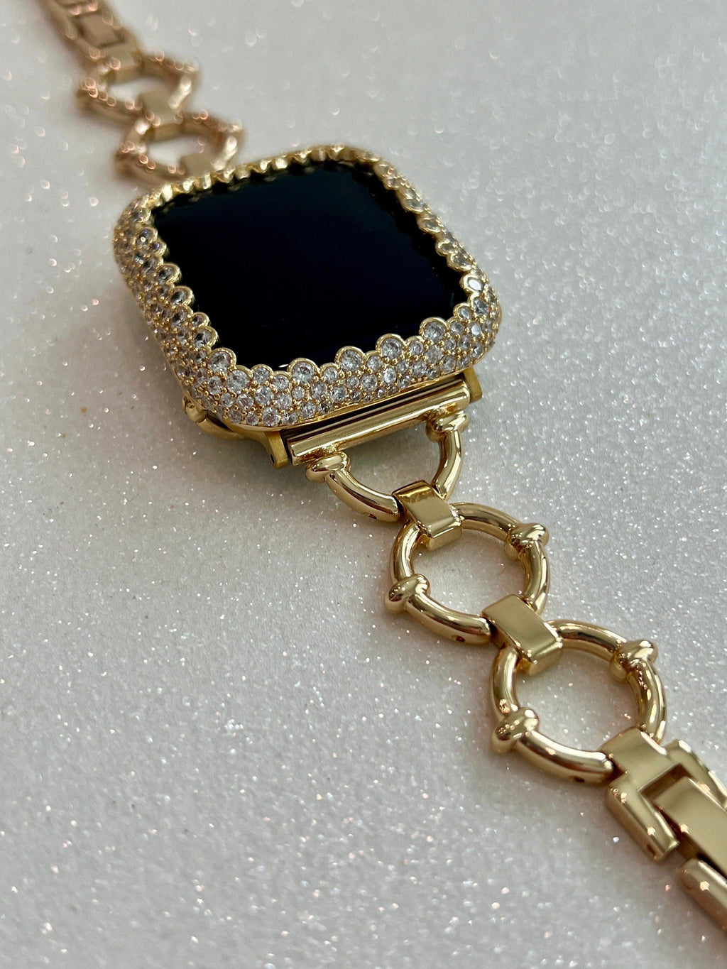 Our Circle Link Apple Watch Band comes with three options: the band only, band + bezel set, or bezel cover only. You can simply select your preferred option from the drop-down menus. For an extra touch of elegance, you can also add a 14k gold plated metal Apple Watch case with hand-set pave lab diamonds. This case features two bars on the back to securely hold the watch in place and allows access to all buttons. Please note that this case does not come with a screen protector.