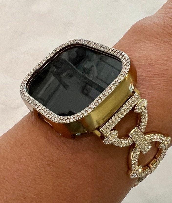 Fits the Apple Watch Sizes 38mm 40mm 41mm 42mm 44mm 45mm 46mm 49mm Ultra 1/2/3 Series 2-11 SE. This is a custom Iwatch Candy Apple Watch Band in Yellow Gold set with Pave High End Crystal in a luxury Alloy Metal with a jewelry style fold over closure and or Poly Carbonate Gold Metallic Case with one row of High End Swarovski Crystals. Easy snap on case with access to all buttons.The sparkle on this band is amazing. Can be adjusted to fit wrist sizes from 6.35 (6.50" on a 49mm)" to 8.5". Easy to resize no tool need, comes with instructions. Please measure your wrist before purchasing as we do not sell extra links and this band cannot be made any smaller than stated.