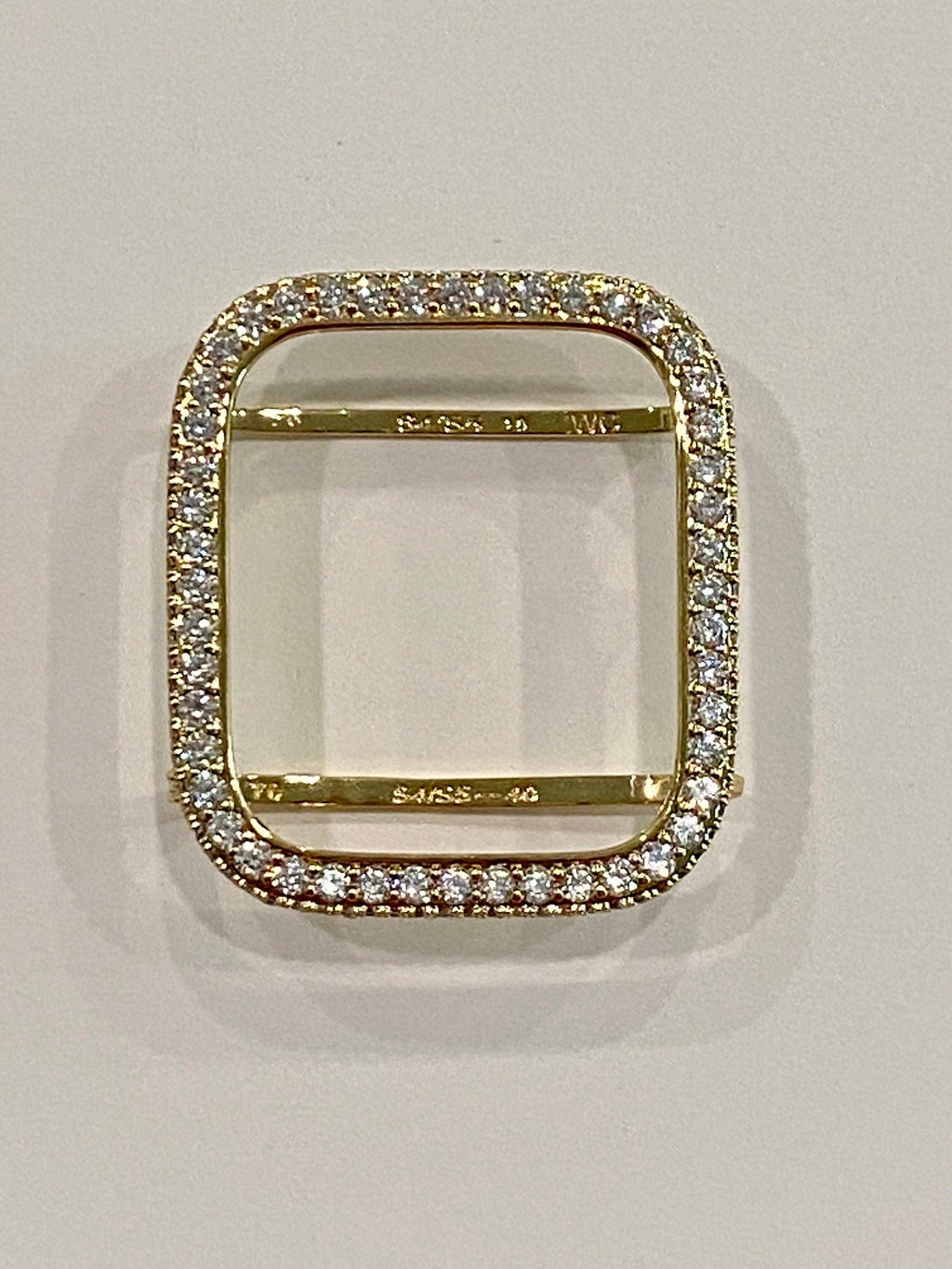 For the ultimate in sparkle, add the Yellow Gold Apple Watch Case in 14K Gold Plated Metal with hand set high quality 2.5mm and Pave Lab Diamonds. This apple watch cover has two bars on the back to hold the apple watch in place with access to all buttons, no screen protector**Apple Watch is not include used for photo shoot only*