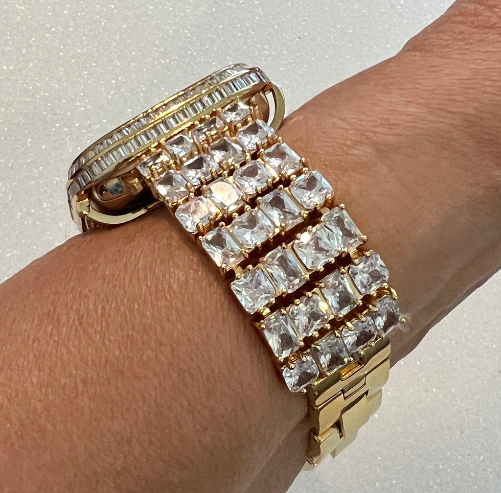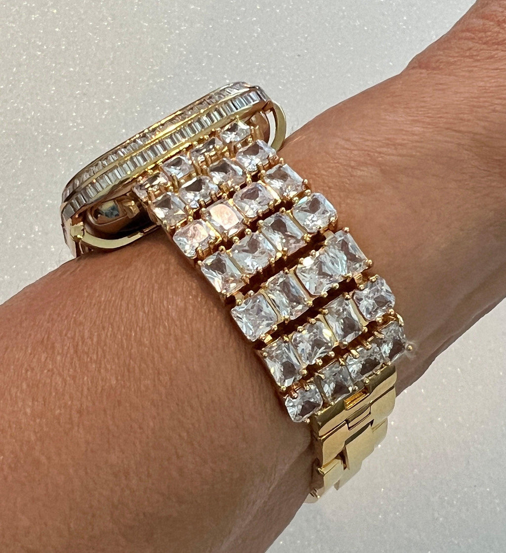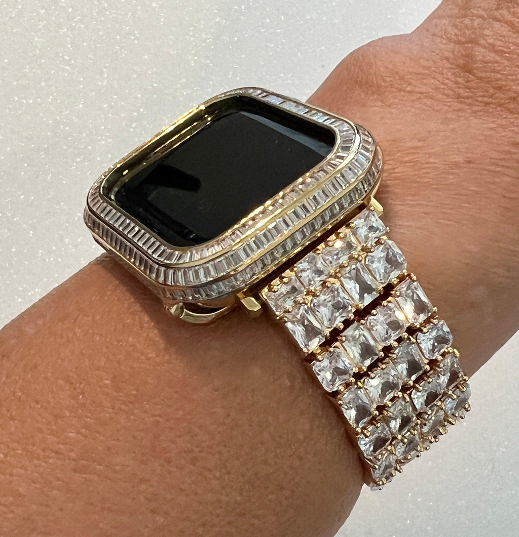 Designer Yellow Gold Apple Watch Band Woman Baguette & Radiant Cut High End Crystals and or Apple Watch Cover Lab Diamond Bezel 40mm-45mm. Fits the Apple Watch available for sizes 40mm 41mm 44mm 45mm in series 4,5,6,7,8,9 or SE Men's & Women's. This is a custom design made to fit the Apple Watch, it is not a brand copy. Gold Apple Watch Band with Large 4mmx6mm Baguettes & 5mmx5mm Radiant Cut High Quality High End Crystal Princess set in 14k yellow gold plating. This band has huge sparkle and bling which you can see best in the video. Luxury Band and Bezel, purchase the band only or set.