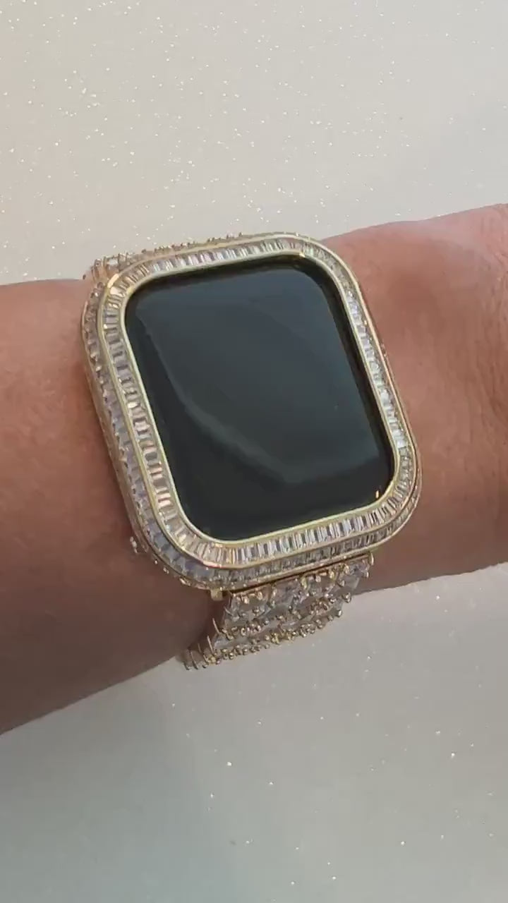 Add Silver custom 14k yellow gold plated Metal Apple Watch Case Cover Bezel with 3 rows of baguette lab diamonds. Snap closure, easy to get on and off. Access to all button.
