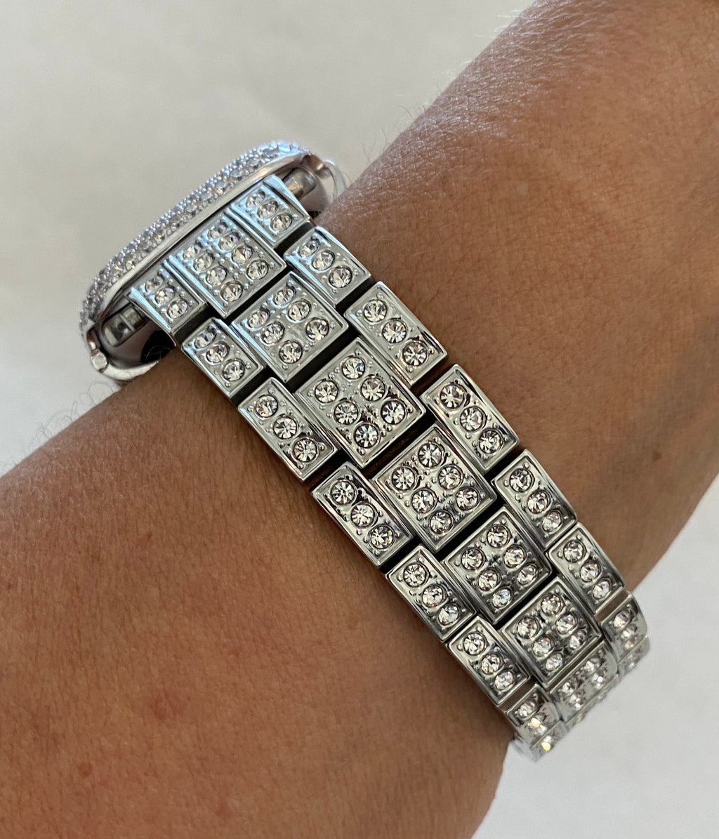 Fits the Apple Watch available for sizes 38mm 40mm 41mm 42mm 44mm 45mm 46mm Series 2-11 SE Ultra 1/2/3 Men's & Women's. This is a custom design made to fit the Apple Watch, it is not a brand copy. This band feature large High End Swarovski Crystals set in high polish Stainless Steel with a butterfly closure.