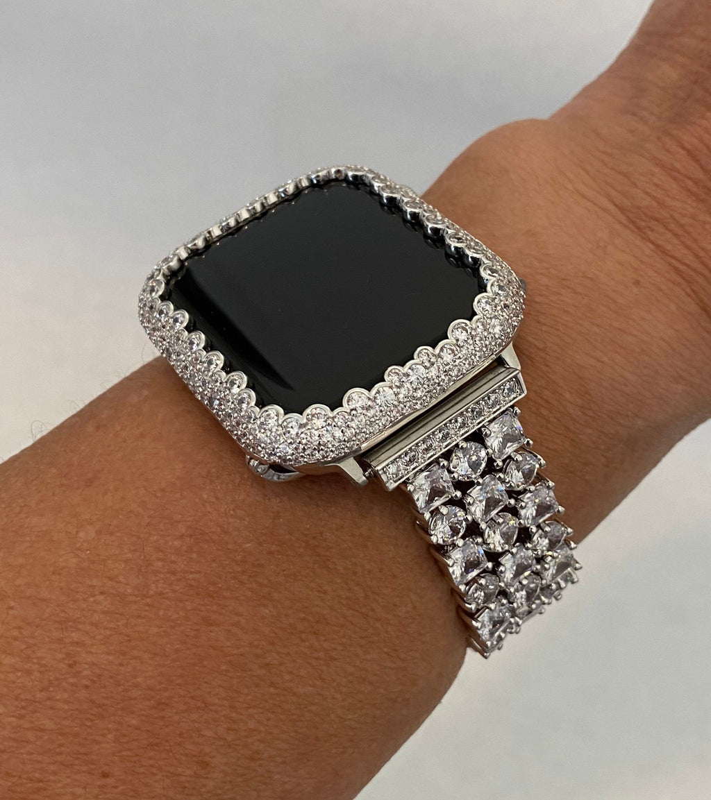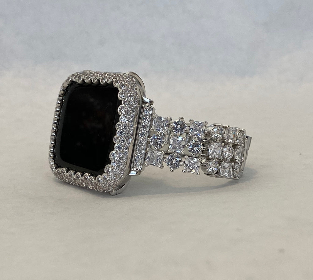 Make your Apple Watch stand out even more with our Silver Custom Apple Watch Case, featuring a 14k white gold plated metal bezel and hand-set lab diamonds in various sizes. The case has two bars on the back to securely hold the watch in place, with full access to all buttons. Please note that this case does not come with a screen protector.