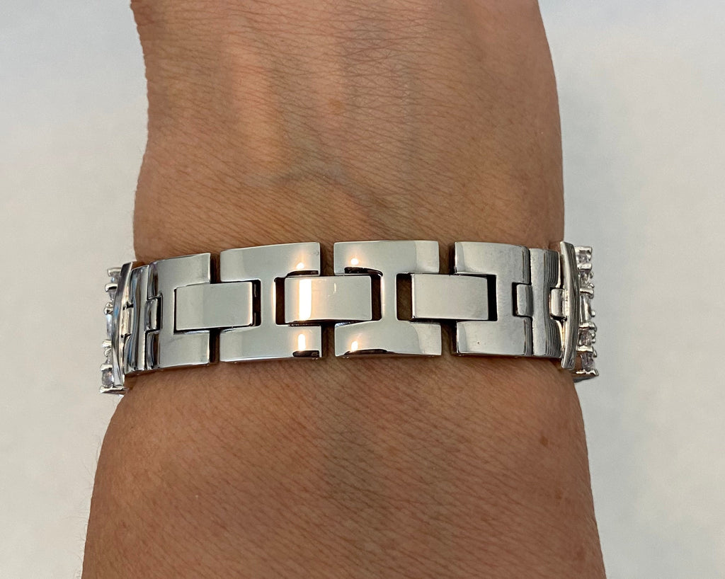 The band is made with large, high-quality princess and round High End Swarovski Crystals, set in a silver alloy plated metal for durability and shine. It can easily be resized without any tools needed - simply open the fold-over links with your fingers. The band fits wrist sizes 5.75 inches to 7.25 inches and cannot be made any shorter. However, we do offer extra links at $10 each, which are 1/4 inch long. Please contact us before purchasing to order extra links, as availability is limited.