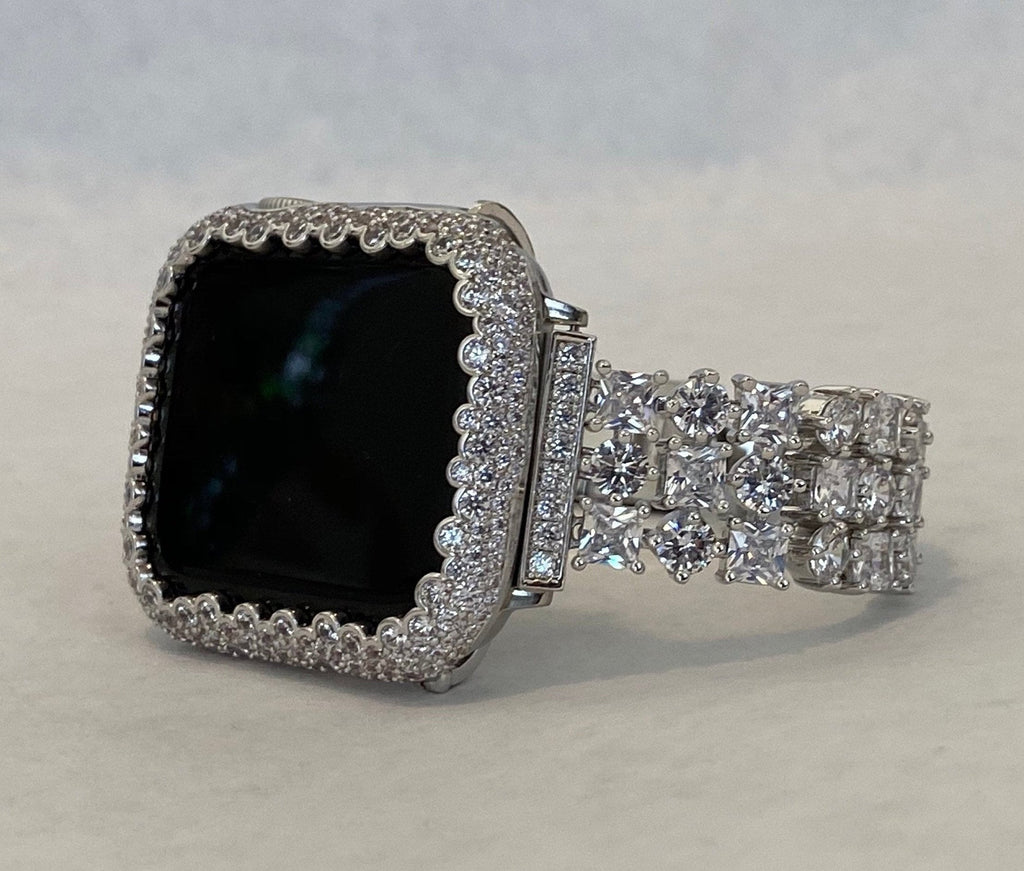 Materials: Swarovski Crystals band, silver alloy plating apple band, lab diamonds apple case, 14k white gold plating apple case.