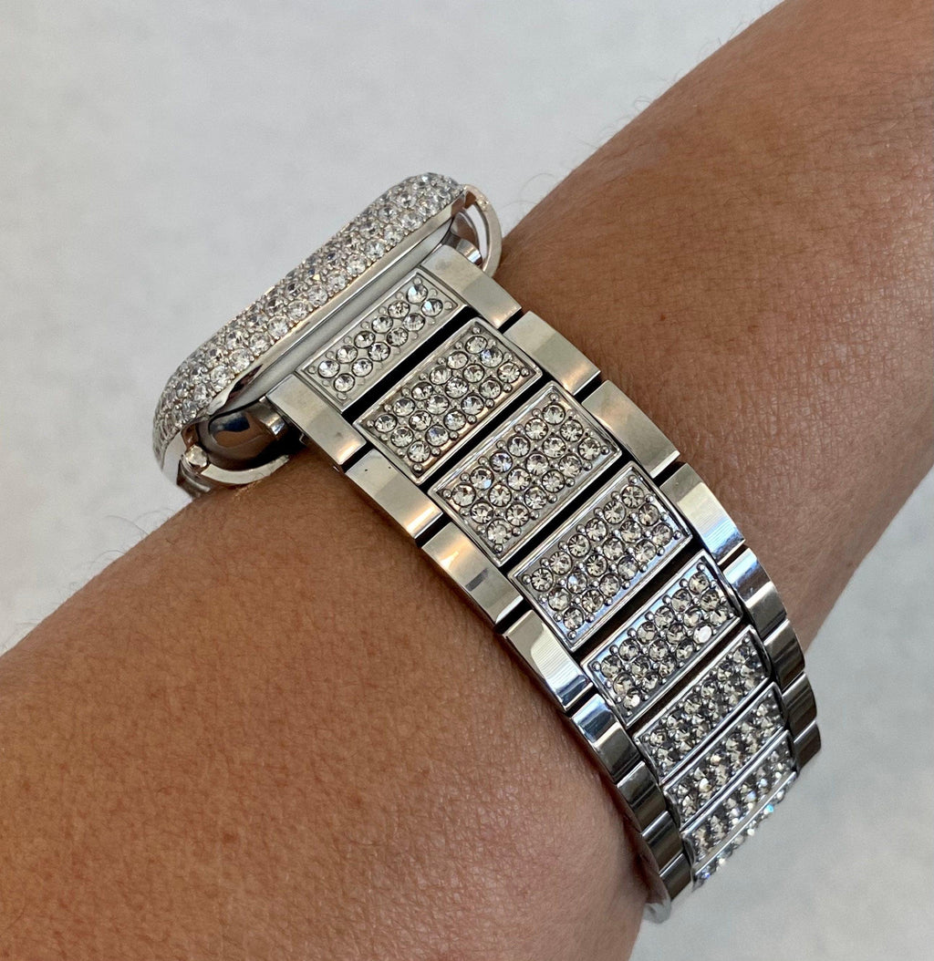 Apple Watch Band Material: Silver Stainless Steel for durability and shine with hand set Swarovski Crystals Elements