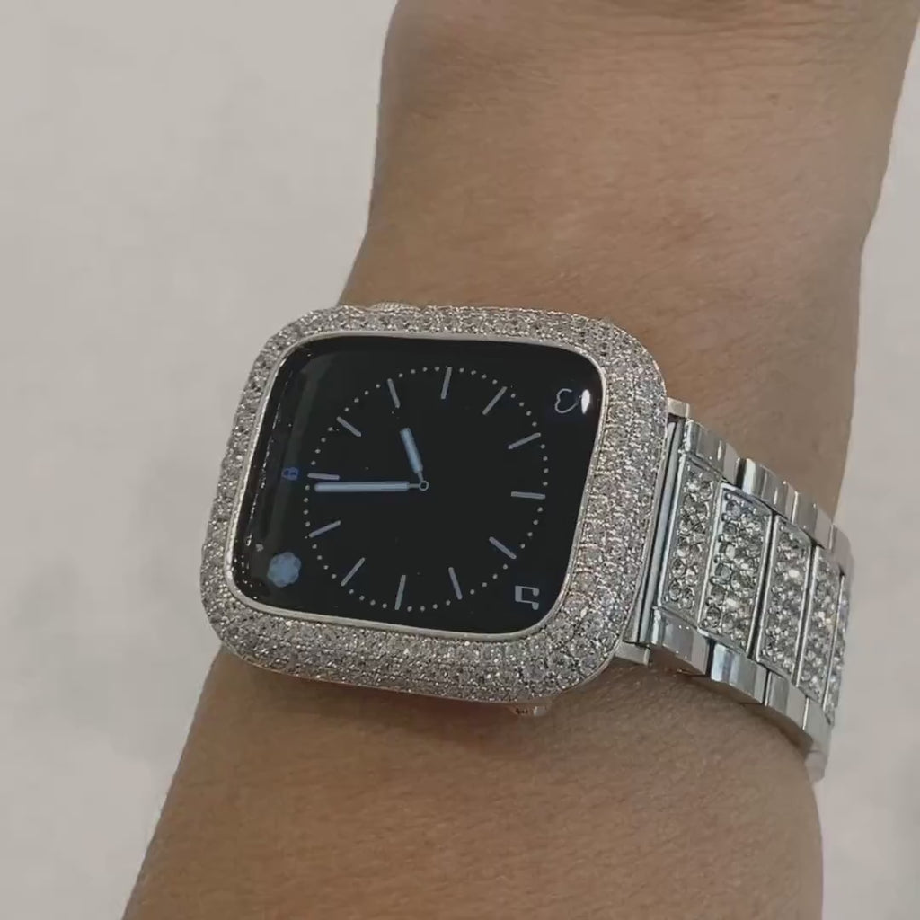 Materials: Swarovski Crystals apple band, stainless steel apple band, lab diamonds apple case, 14k white gold plating apple case.