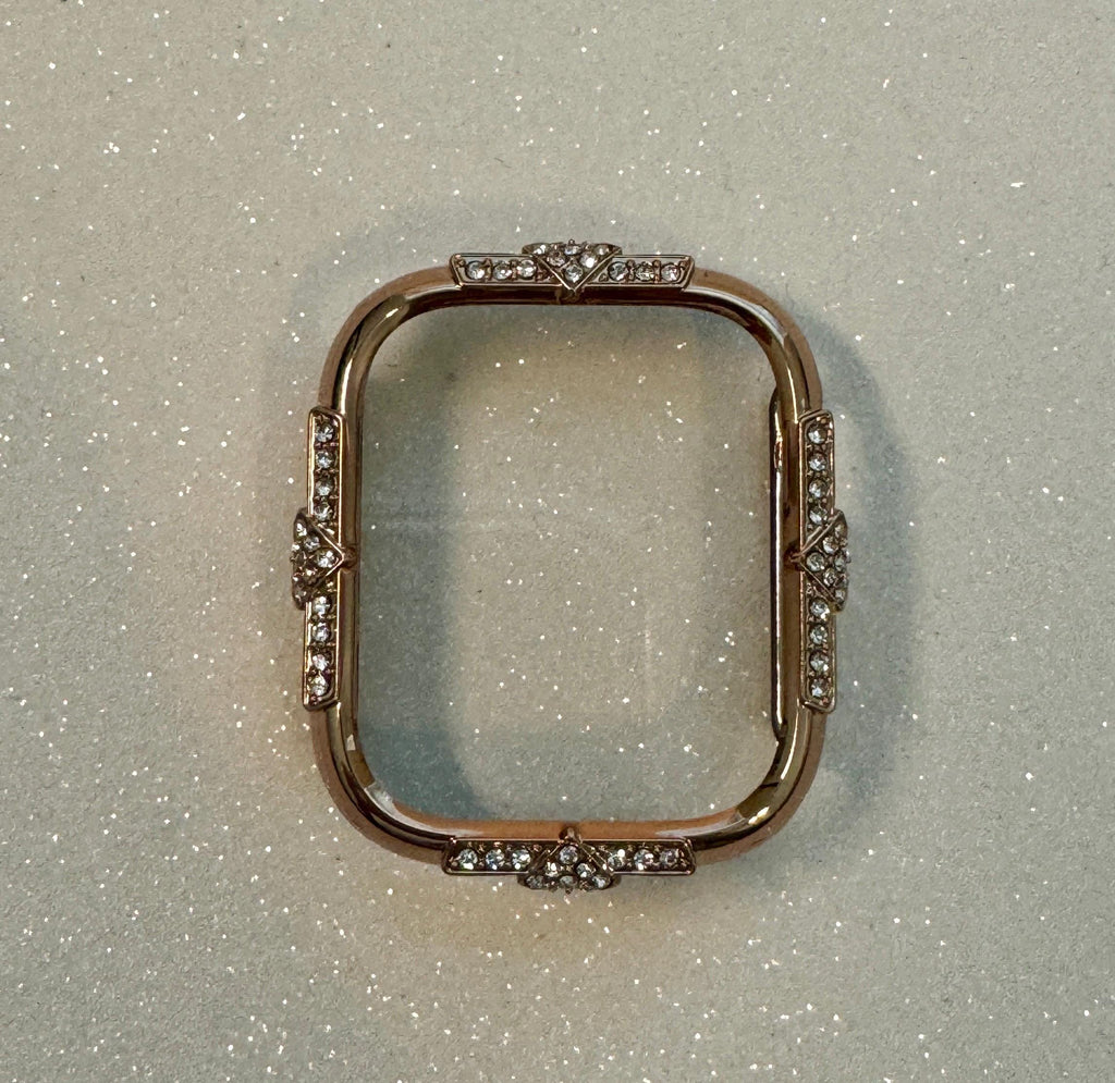 Apple Watch Case Materials: Swarovski Crystals embedded in a metallic rose gold plated poly carbonate hard frame with tempered glass screen protector built in.