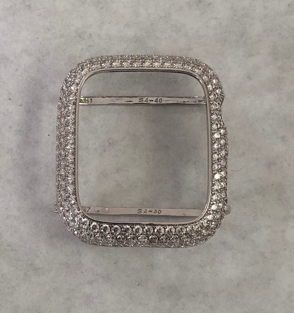 Add a custom 14k white gold plated Metal Case Cover Bezel with micro pave lab diamonds. Two Bars on the back hold the watch firmly in place, easy to get on and off. Access to all button.