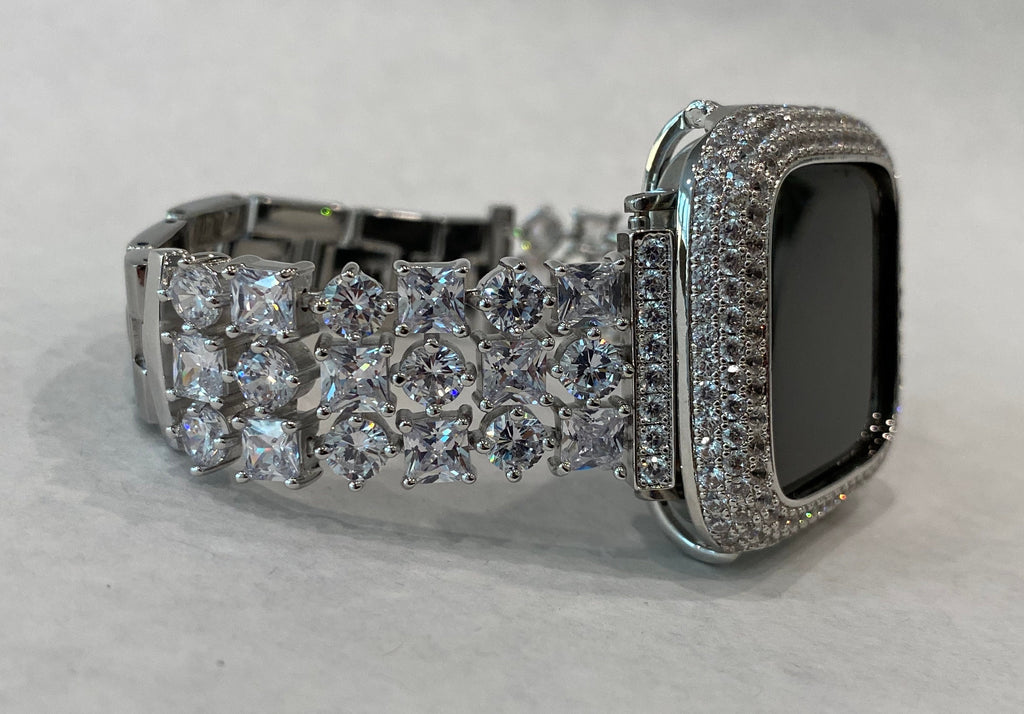 Fits the Apple Watch available for sizes 38mm 40mm 41mm 42mm 44mm 45mm 46mm 49mm Ultra 1 or 2 Series 2-10 & SE Men's & Women's. This is a custom design made to fit the Apple Watch, it is not a brand copy. Iwatch Band with Large High Quality Princess and Round High End Swarovski Crystals. Luxury Band and Bezel, purchase the band only or set. Silver Plated Metal Band loaded with High End Crystals. Iwatch Candy for your Apple Watch