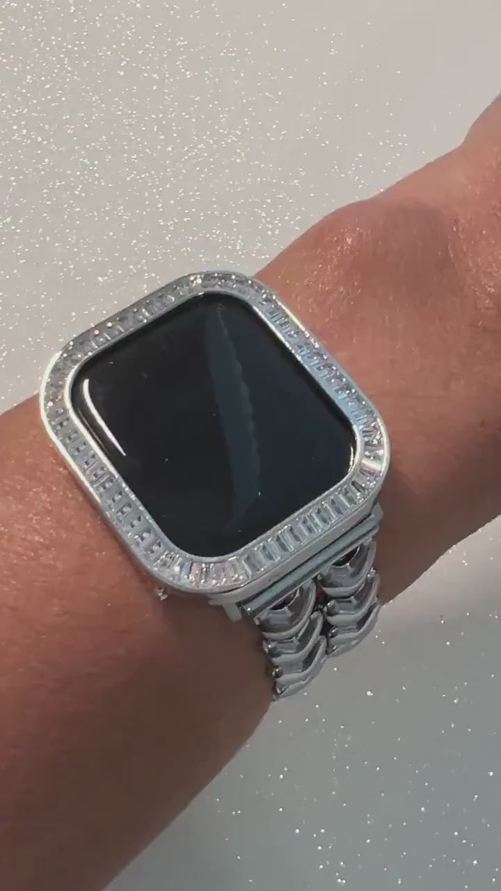 Our Heart Apple Watch Band comes with three options: the band only, band + bezel set, or bezel cover only. You can simply select your preferred option from the drop-down menus. For an extra touch of elegance, you can also add a 14k white gold plated metal Apple Watch case with hand-set large baguette lab diamonds. This case features two bars on the back to securely hold the watch in place and allows access to all buttons. Please note that this case does not come with a screen protector.