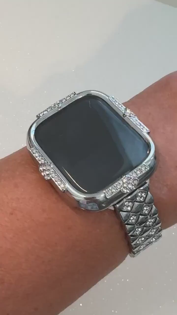 Apple Watch Case Materials: Swarovski Crystals embedded in a metallic silver plated poly carbonate hard frame with tempered glass screen protector built in.