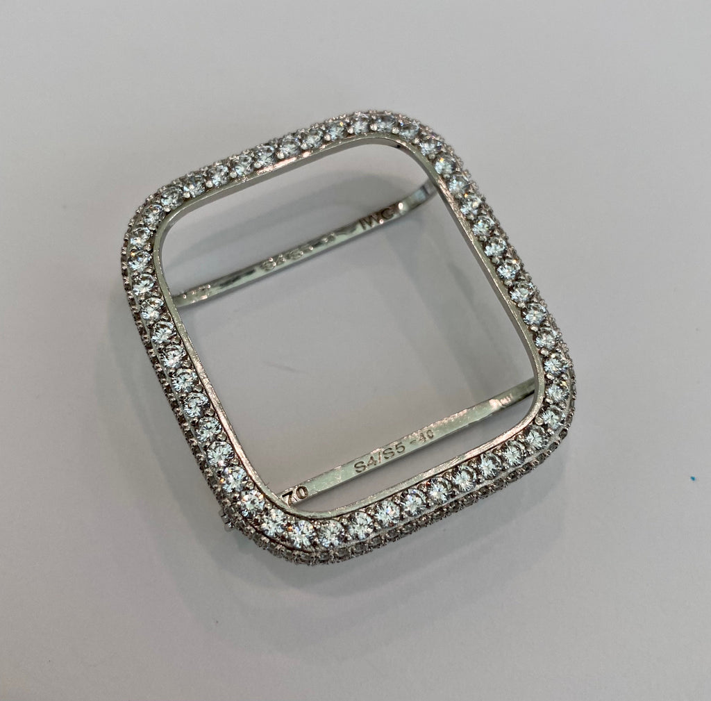 Apple Watch Case Materials: 14kt White gold plating over a metal base with hand set pave lab created diamonds. Two bars on the back hold the Apple Watch in place with access to all buttons. There is NO screen protector. Instructions Included.
