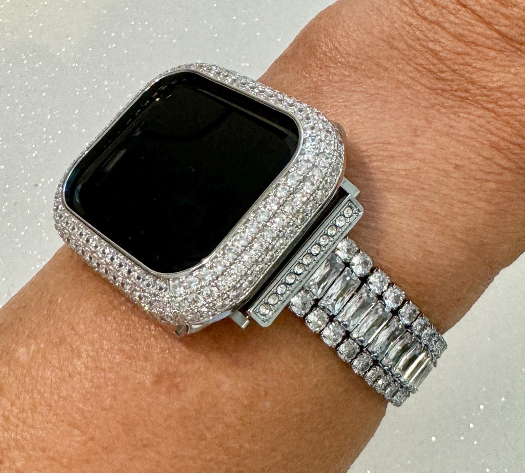 Apple Watch Band Material: Silver 14K gp white gold plating for durability and shine with hand set Baguette and Round Swarovski Crystals Elements with amazing sparkle.
