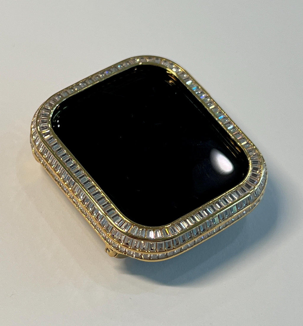 Apple Watch Case Materials: 14kt gold plating over a metal base with 3 rows of hand set Baguette lab created diamonds. Two bars on the back hold the Apple Watch in place with access to all buttons. There is NO screen protector. Instructions Included.