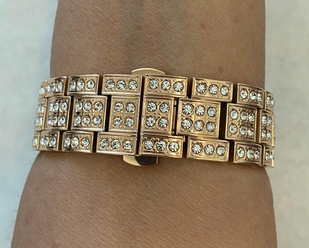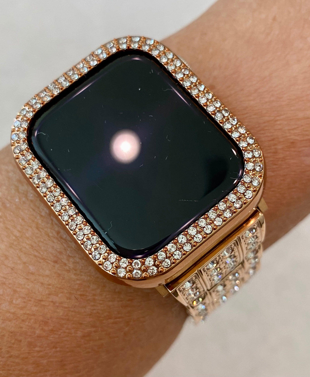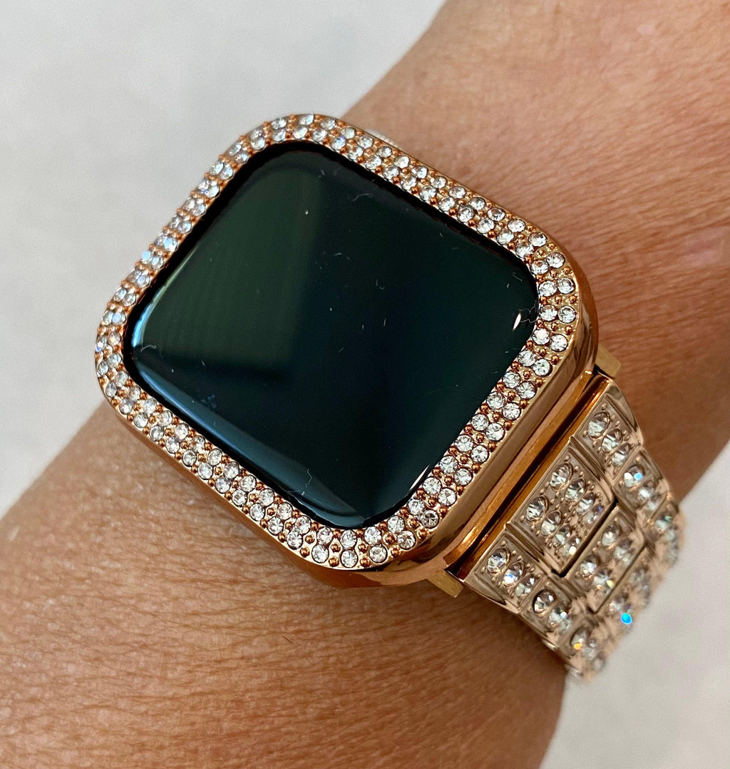Fits the Apple Watch Sizes 38mm 40mm 41mm 42mm 44mm 45mm 46mm 49mm Ultra 1/2/3 Series 2-11 SE. Premium Rose Gold Stainless Band with large 3mm High End Swarovski Crystals with a premium Butterfly Buckle Closure & or Poly Carbonate Rose Gold Metallic Case with two rows of sparkling Swarovski Crystals. Easy snap on case with access to all buttons in a durable poly carbonate (plastic). There is no screen protector and the case is not metal.