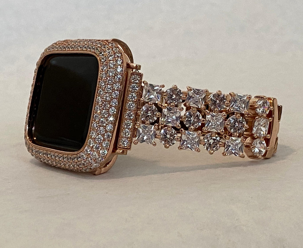 Fits Apple Watch in sizes 38mm 40mm 42mm 41mm 44mm 45mm 46mm Series 2-11 SE. 49mm Ultra 1/2/3. Luxury Apple Watch Band loaded with round and square cut High End Crystals set in a high polish rose gold plated band.