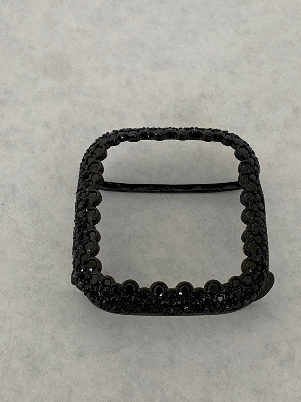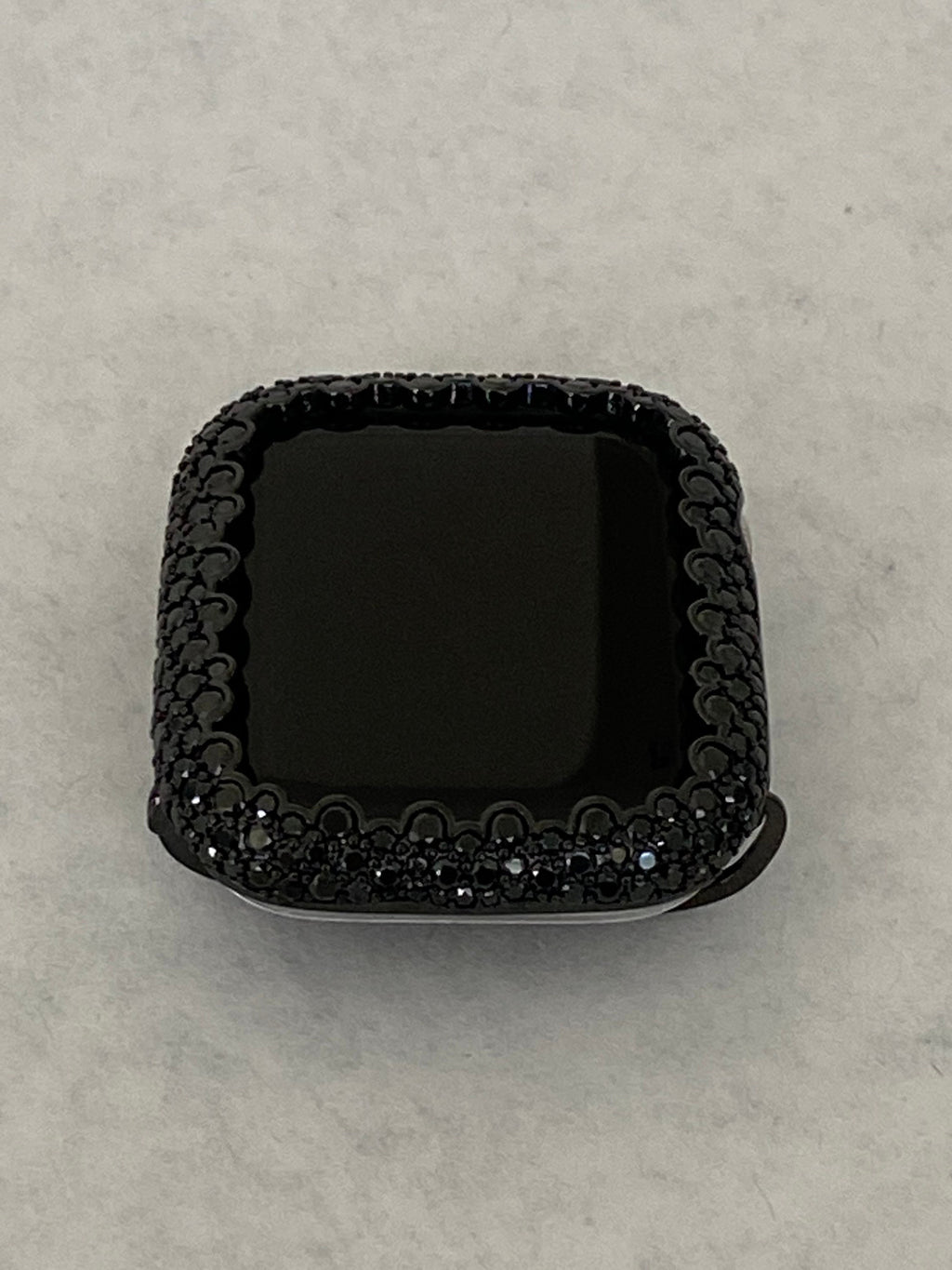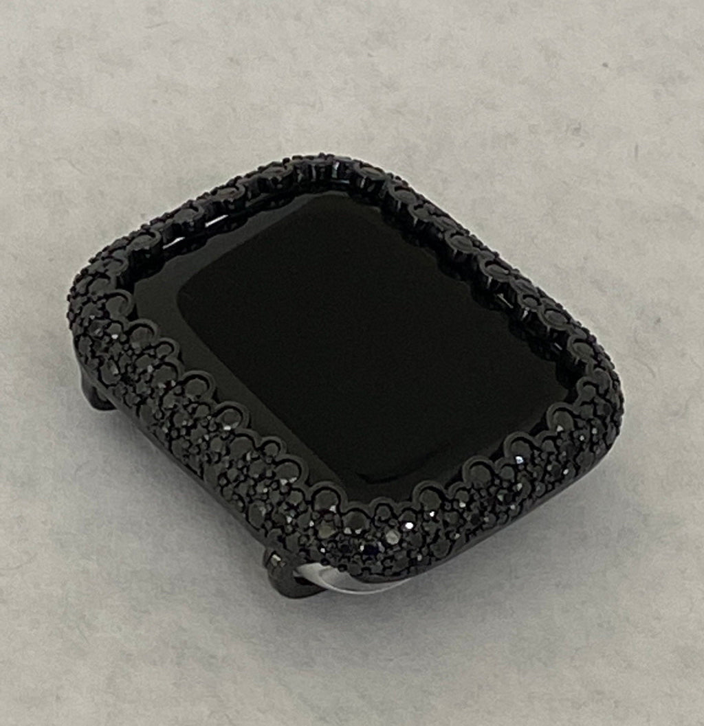Fits the Apple Watch available for sizes 38mm 40mm 41mm 42mm 44mm 45mm 46mm Series 2-11 SE Ultra 1/2/3 Men's & Women's (see photo labeled 49mm-slightly different due to watch design). Apple Watch Case Black on Black Custom Rhodium Plated Metal Bezel style case cover with Black lab diamonds around the face and micro pave lab diamonds on the sides. Pretty Apple Watch Case in Champagne Bubbles, Elegant Apple Watch Jewelry.