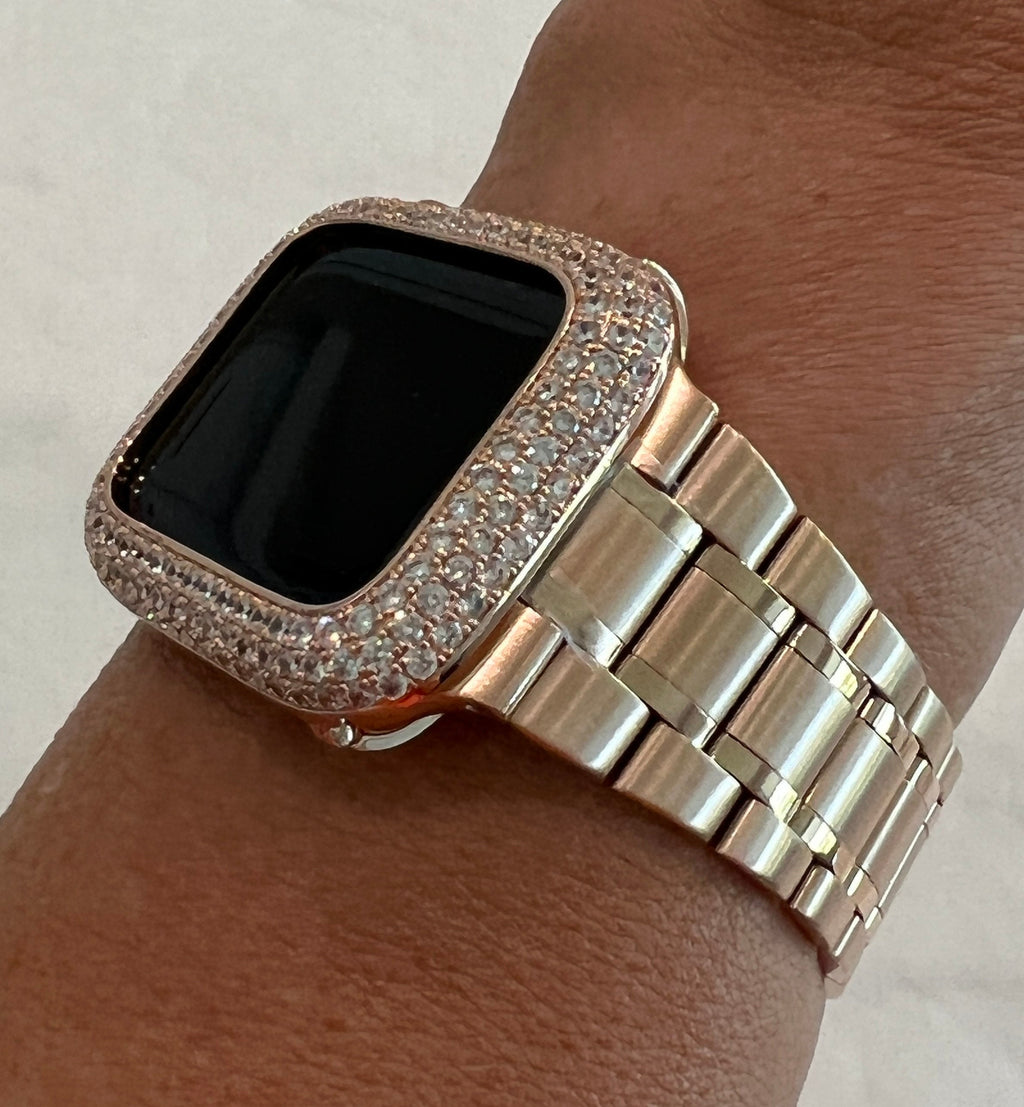 Add a custom 14k rose gold plated Metal Case Cover Bezel with hand set 2.5mm large lab Diamonds on top and micro pave lab diamonds on the sides. Two bars on the back hold the watch firmly in place, easy to get on and off. Access to all button.