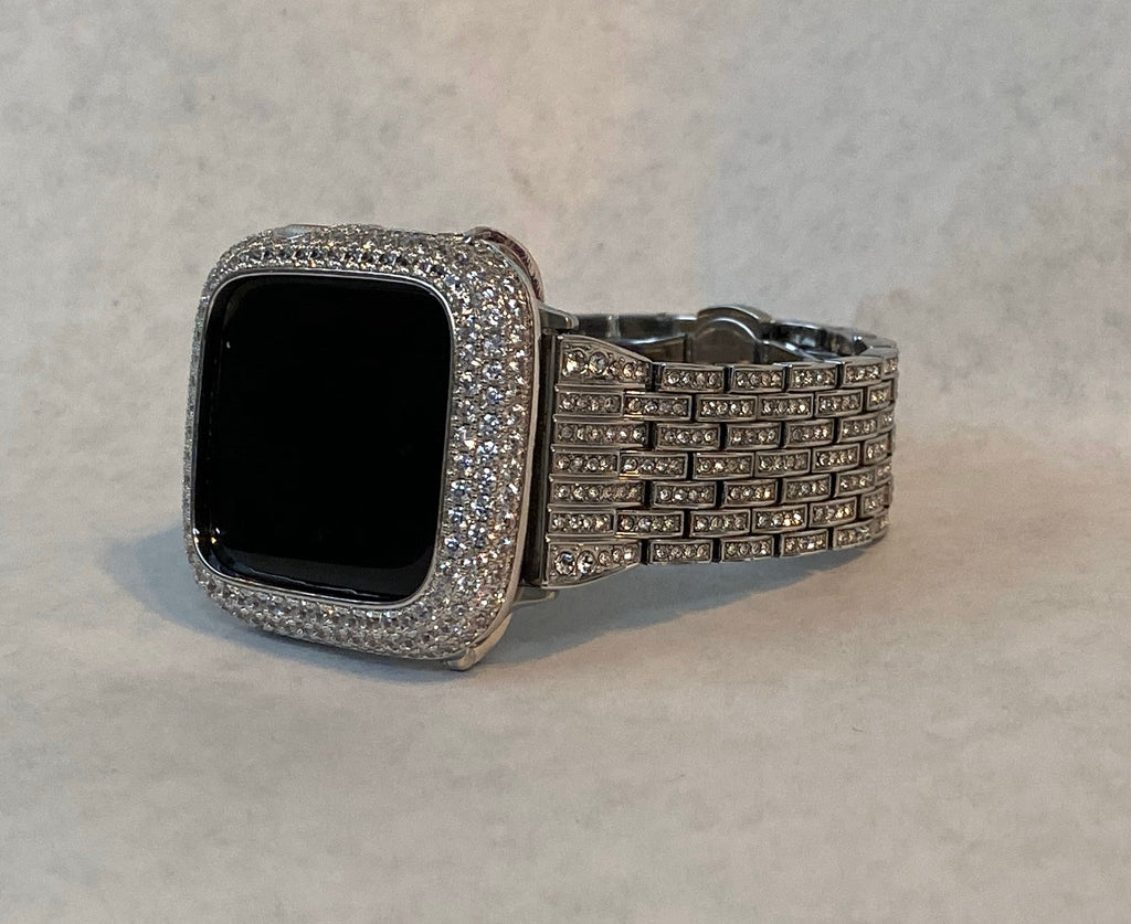 Apple Watch Case Materials: 14kt White gold plating over a metal base with hand set pave lab created diamonds. Two bars on the back hold the Apple Watch in place with access to all buttons. There is NO screen protector. Instructions Included.
