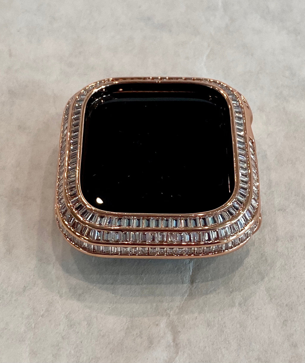 Add a Rose Gold custom 14k rose gold plated Metal Case Cover Bezel 3 rows of Lab Diamond Baguettes. Two bars on the back hold the watch in place with access to all button, no screen protector.