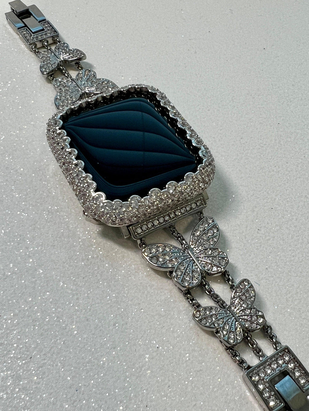 Fits the Apple Watch available for sizes 38mm 40mm 41mm 42mm 44mm 45mm 46mm Series 2-11 SE Ultra 1/2/3 Men's & Women's (see photo labeled 49mm-slightly different due to watch design) . Pretty Designer Apple Watch Band Butterflies with pave Swarovski Crystals set in silver alloy for durability and shine. You can purchase the apple watch band only or apple watch case only or buy it as a set.