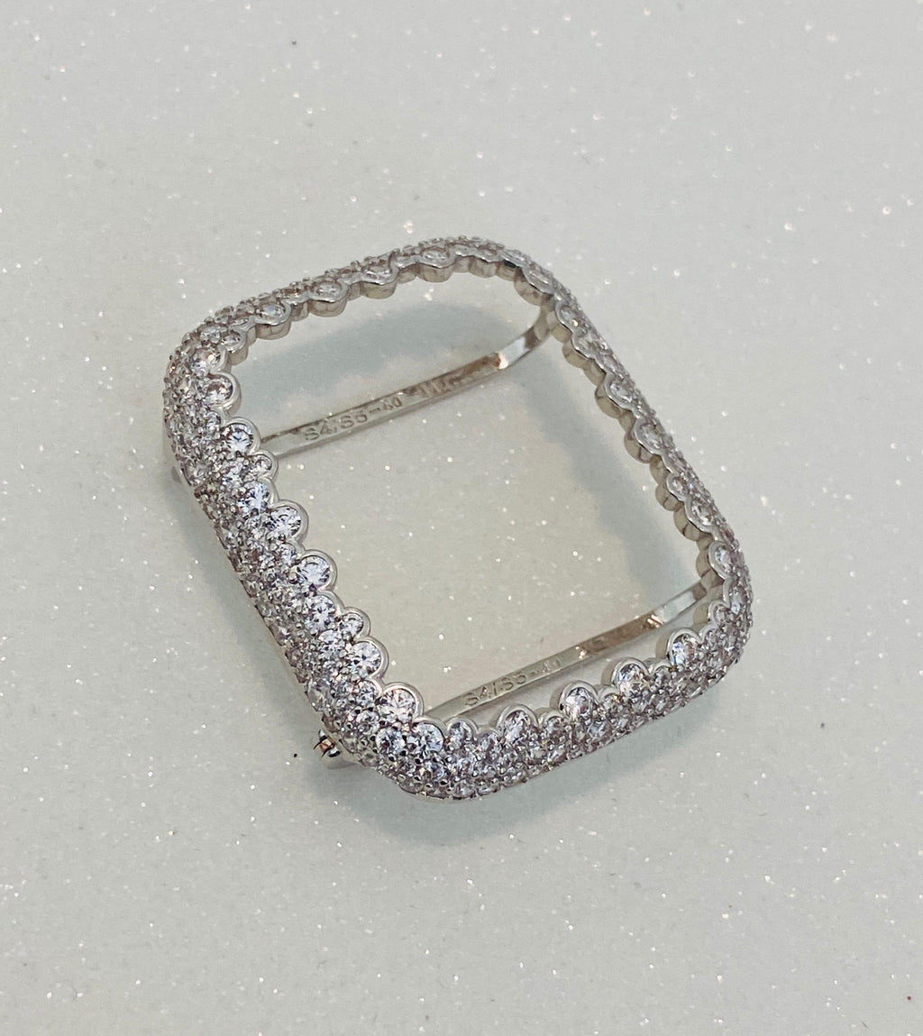 Add a Silver Custom plated in 14k White Gold and set with high quality micro pave lab diamonds. Two bars on the back hold the watch firmly in place, easy to get on and off. Access to all button.