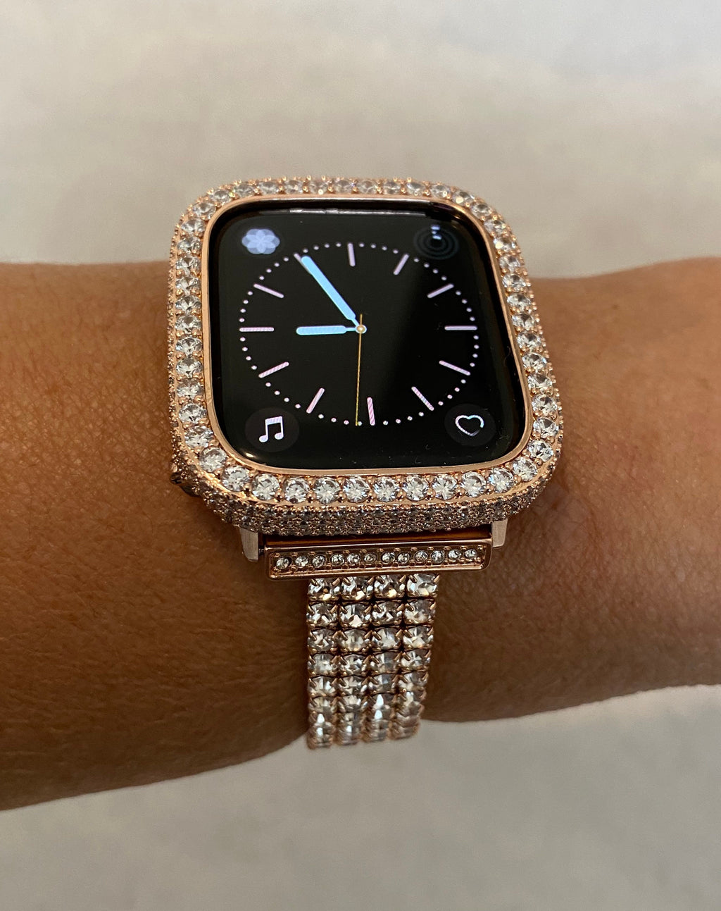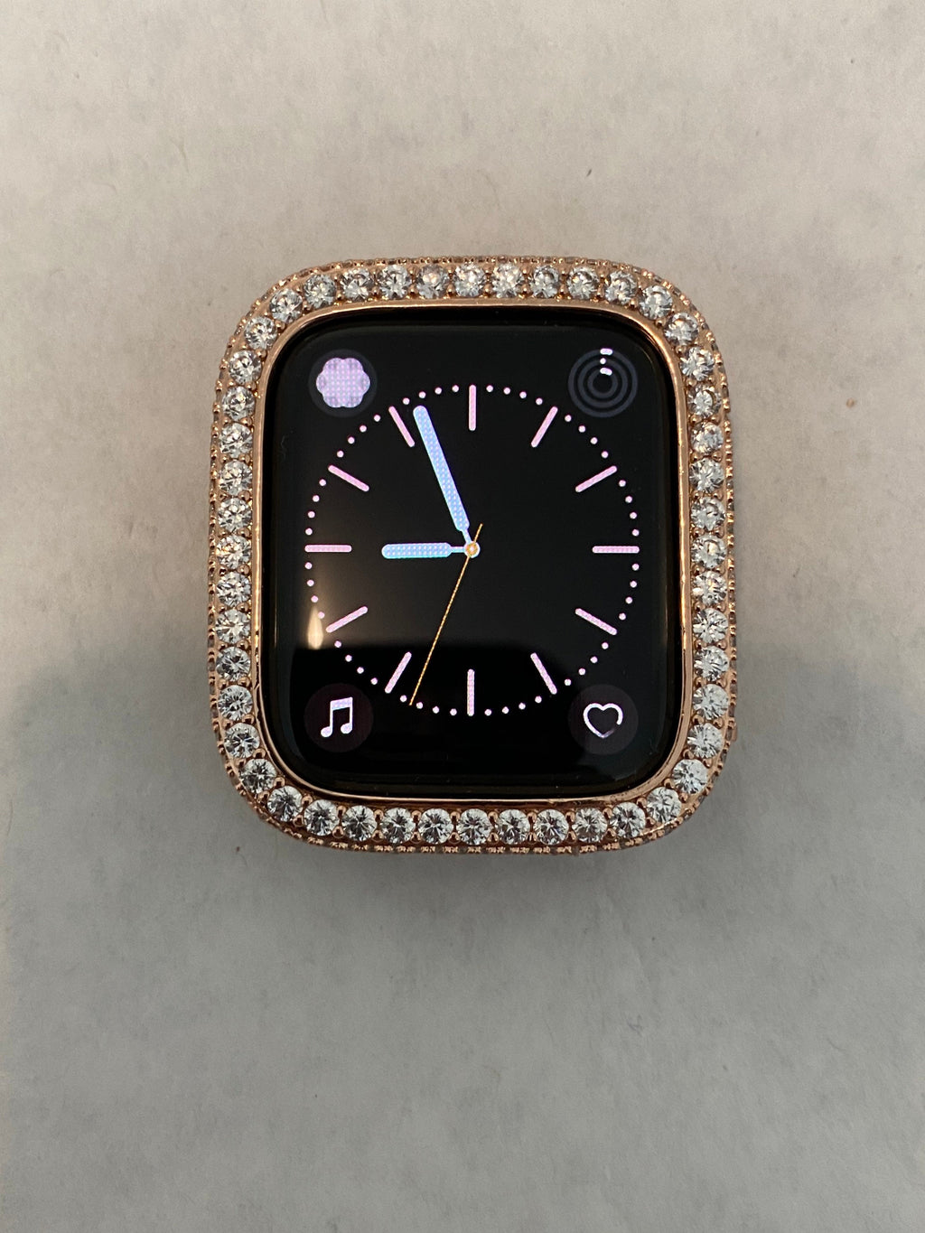 Apple Watch Case Materials: 14kt rose gold plating over a metal base with hand set pave lab created diamonds. Two bars on the back hold the Apple Watch in place with access to all buttons. There is NO screen protector. Instructions Included.