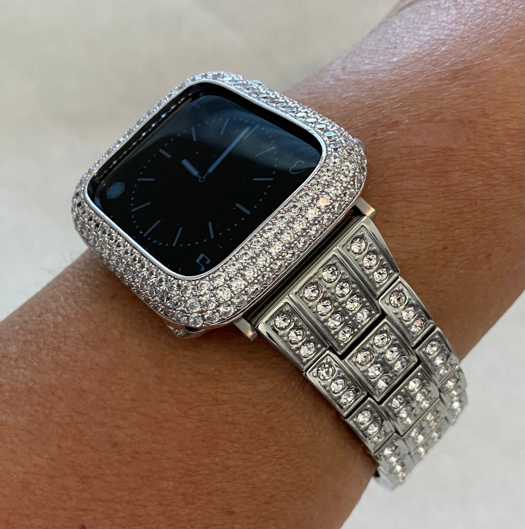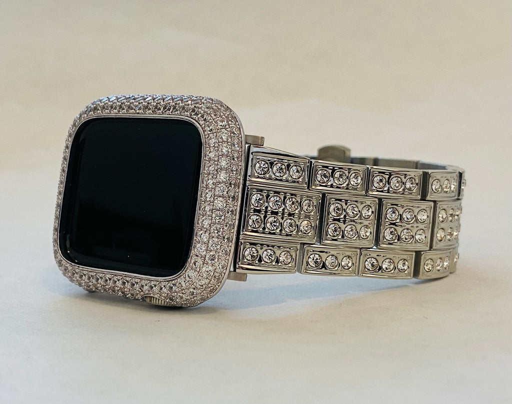 Fits Apple Watch in sizes 38mm 40mm 42mm 41mm 44mm 45mm 46mm Series 2-11 SE. 49mm Ultra 1/2/3. This is a custom design made to fit the Apple Watch, it is not a brand copy. is high on the bling with a silver stainless steel band that features hand set large 2.5mm sparkling High End Swarovski Crystals with a butterfly buckle closure. For the ultimate in sparkle, add the 14k white gold plated bezel with rows of gleaming hand set micro pave lab diamonds. The bezel cover is 14k white gold plated over a base metal.