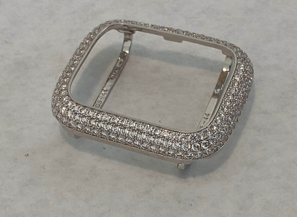 Add a Silver Apple Watch Case Cover Ice Out 14k White Gold Plated Metal Bezel with high quality micro pave lab diamonds. Two bars on the back hold the watch in place with access to all buttons, no screen protector.