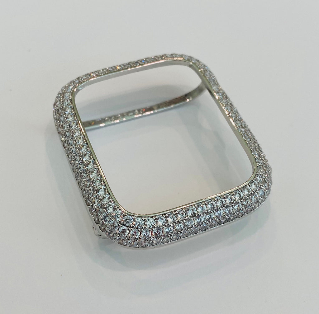 Apple Watch Case Materials: 14kt White gold plating over a metal base with hand set pave lab created diamonds. Two bars on the back hold the Apple Watch in place with access to all buttons. There is NO screen protector. Instructions Included.
