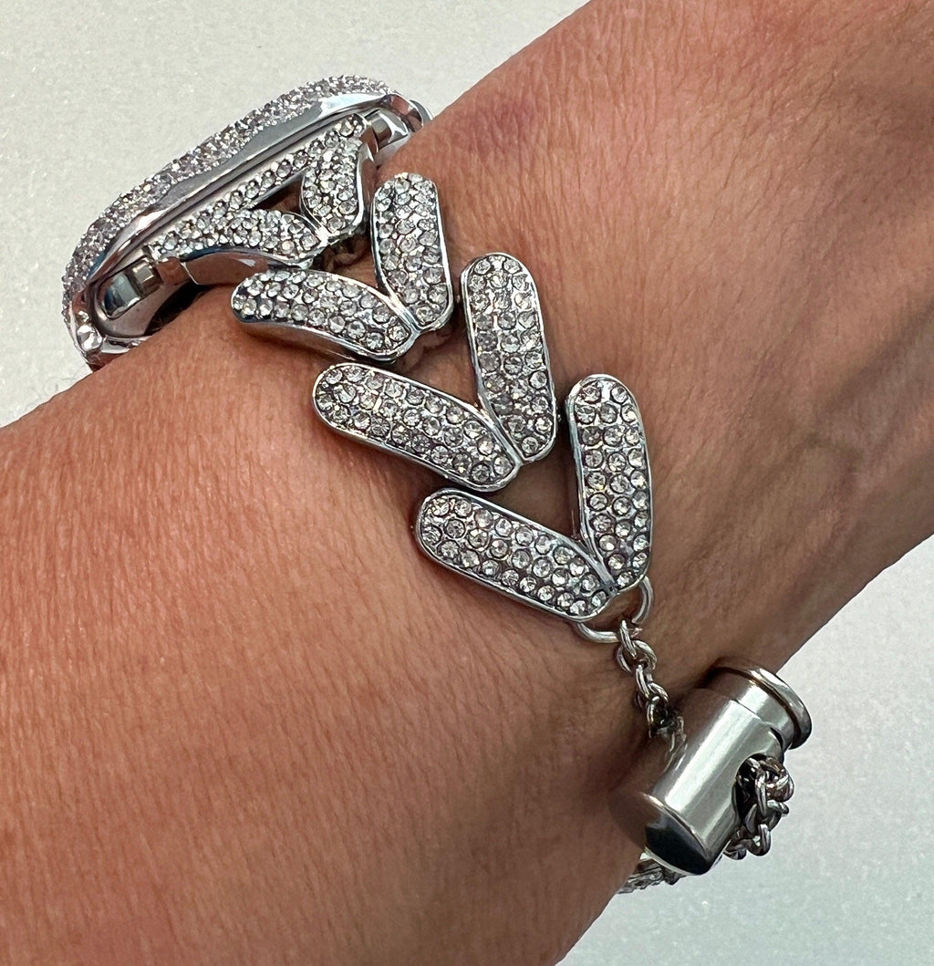 Fits Apple Watch in sizes 38mm 40mm 42mm 41mm 44mm 45mm 46mm Series 2-11 SE. 49mm Ultra 1/2/3 (49mm case is slightly different due to size of watch, please refer to photo labeled 49mm). This apple watch band is a custom design made to fit the Apple Watch, it is not a brand copy. The Apple Watch band has High Quality High End Swarovski Crystal Rhinestones set in a silver alloy plating for durability and shine. It has a pretty crystal heart dangling at the end of the chain. You can purchase this luxury Apple Watch Band or Apple Watch Case as a set or separately.