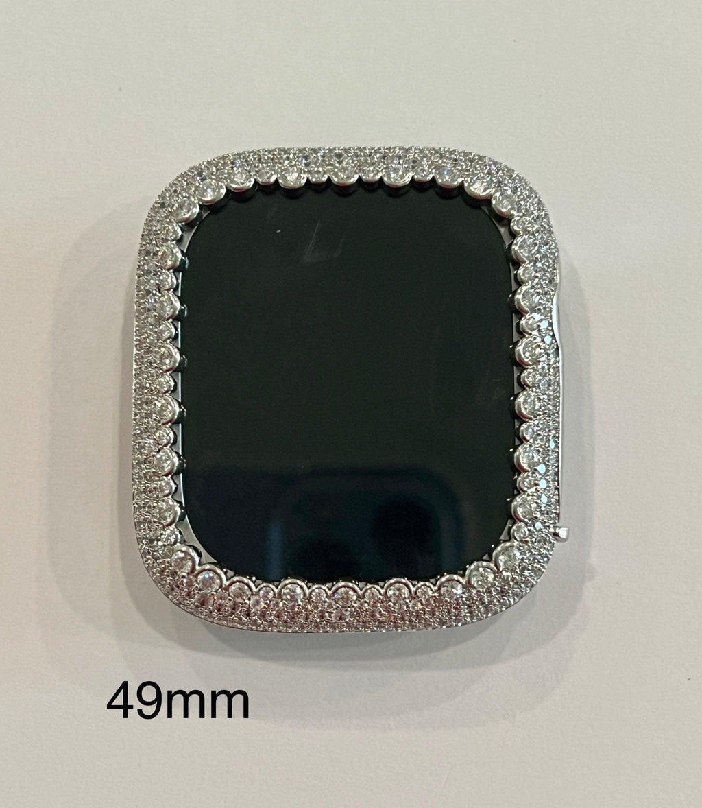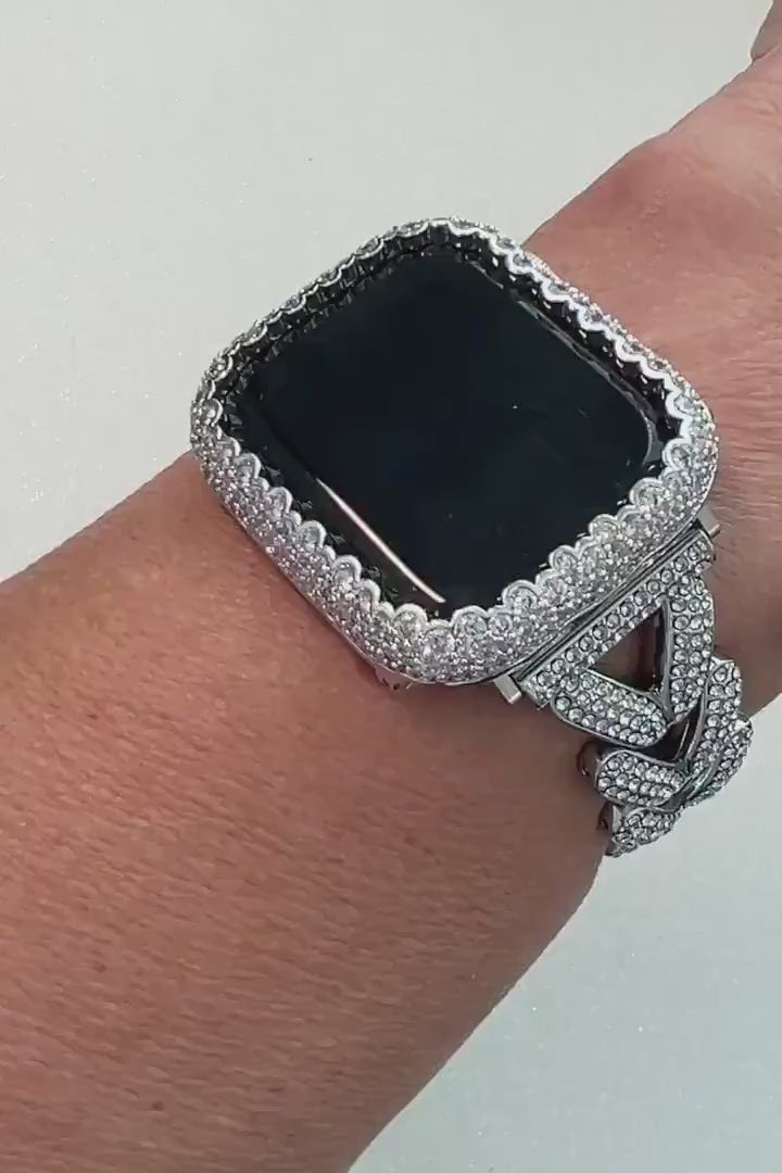 For the ultimate in sparkle, add the Silver Apple Watch Case in 14K White Gold Plated Metal with hand set high quality Pave Lab Diamonds. This apple watch cover has two bars on the back to hold the apple watch in place with access to all buttons, no screen protector.