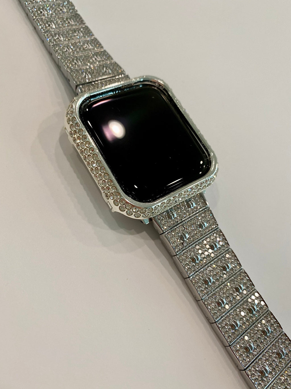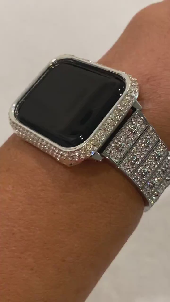 Fits the Apple Watch in size 41mm or 45mm series 7-9. This is a custom Iwatch Candy Apple Watch Band in Silver set with High End Crystal in a luxury Alloy Metal. The sparkle on this band is amazing. Can be adjusted to fit wrist sizes from 5.5" to 7.25". Easy to resize and comes with a tool/instructions. You can select the set band+bezel, band only or bezel cover only using the drop down menus.