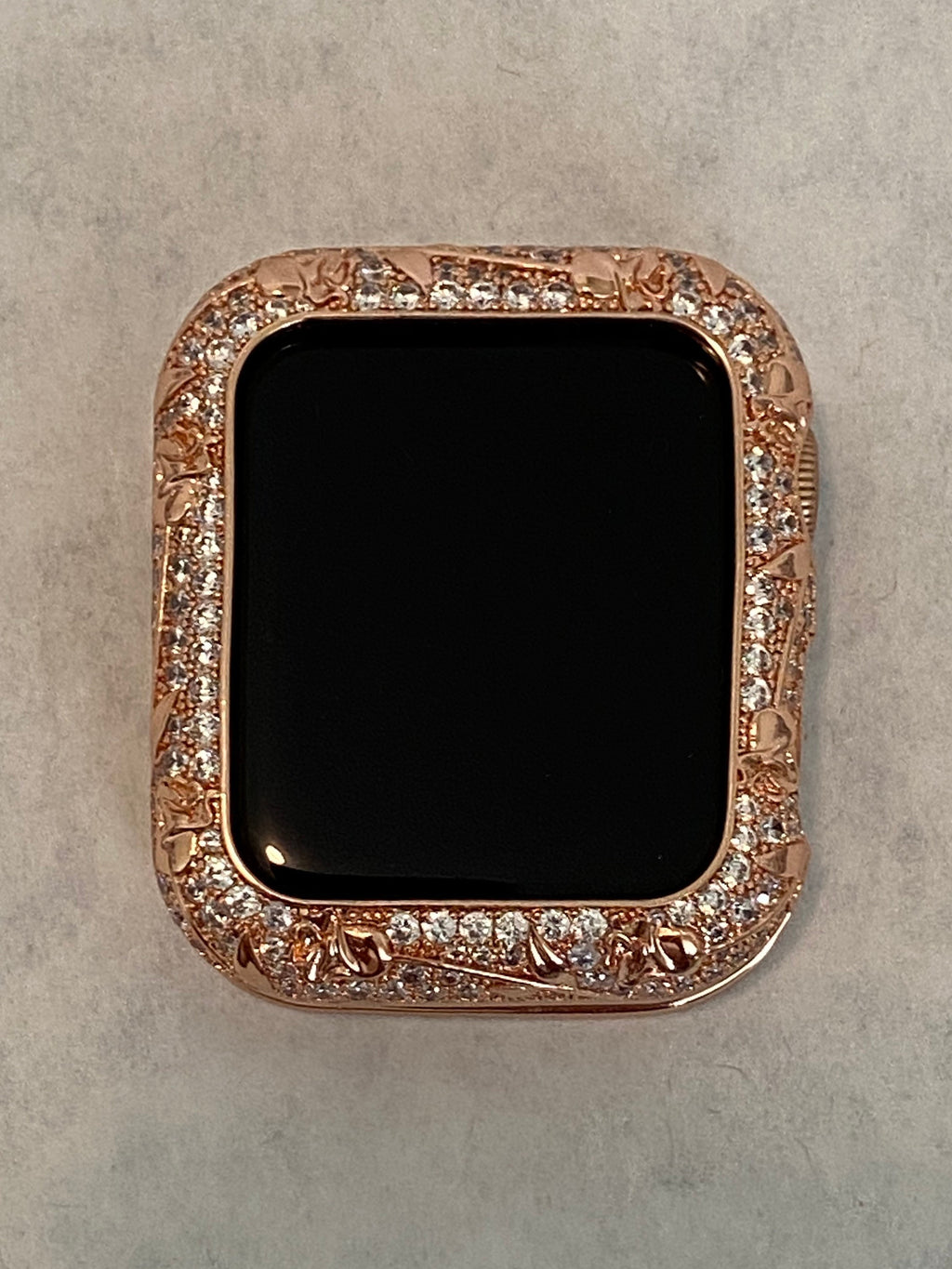 Fits the Apple Watch available for sizes 38mm 40mm 41mm 42mm 44mm 45mm Series 2-9 SE Men's & Women's. Add a Rose Gold Metal Apple Watch Bezel. Secure inset high quality Swarovski Crystals with pretty floral design. Fits easily over your watch sizes 38mm 40mm 41mm 42mm 44mm 45mm. Once watch straps are attached it holds the bezel in place. Watchband must be attached for this bezel to fit properly. Due to the style with no bars on the back it will fit looser than the style with 2 bars.