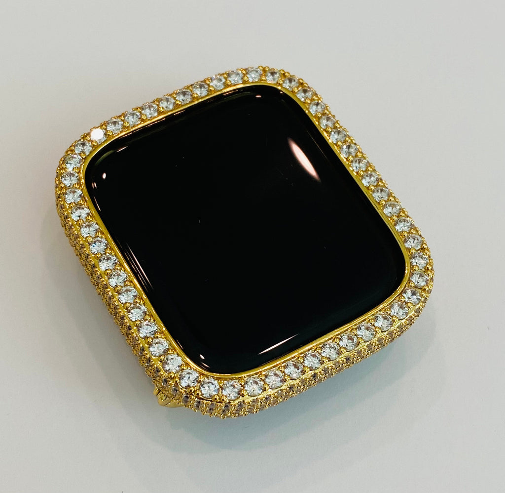 Transform your Apple Watch into a sparkling accessory with our Apple Watch Case Lab Diamond Bezel Cover. This custom design fits the Apple Watch sizes in 38mm, 40mm, 41mm, 42mm, 44mm, 45mm, and 49mm Ultra 1/2 Series 2-9 SE. Our bezel cover is adorned with high-quality 2.5mm lab diamonds on the top and pave on the sides, set in 14k gold plating. This adds a touch of elegance and luxury to your watch.