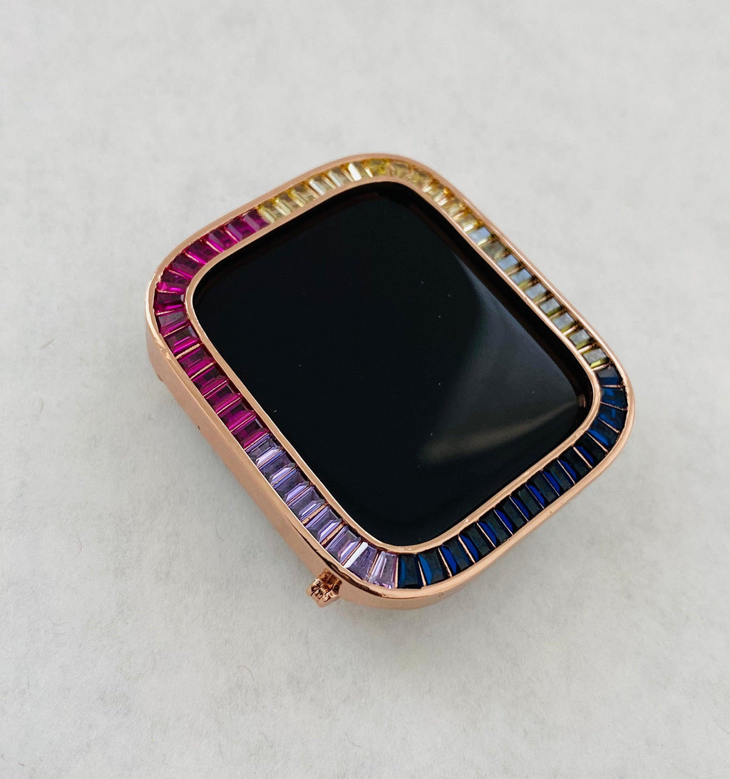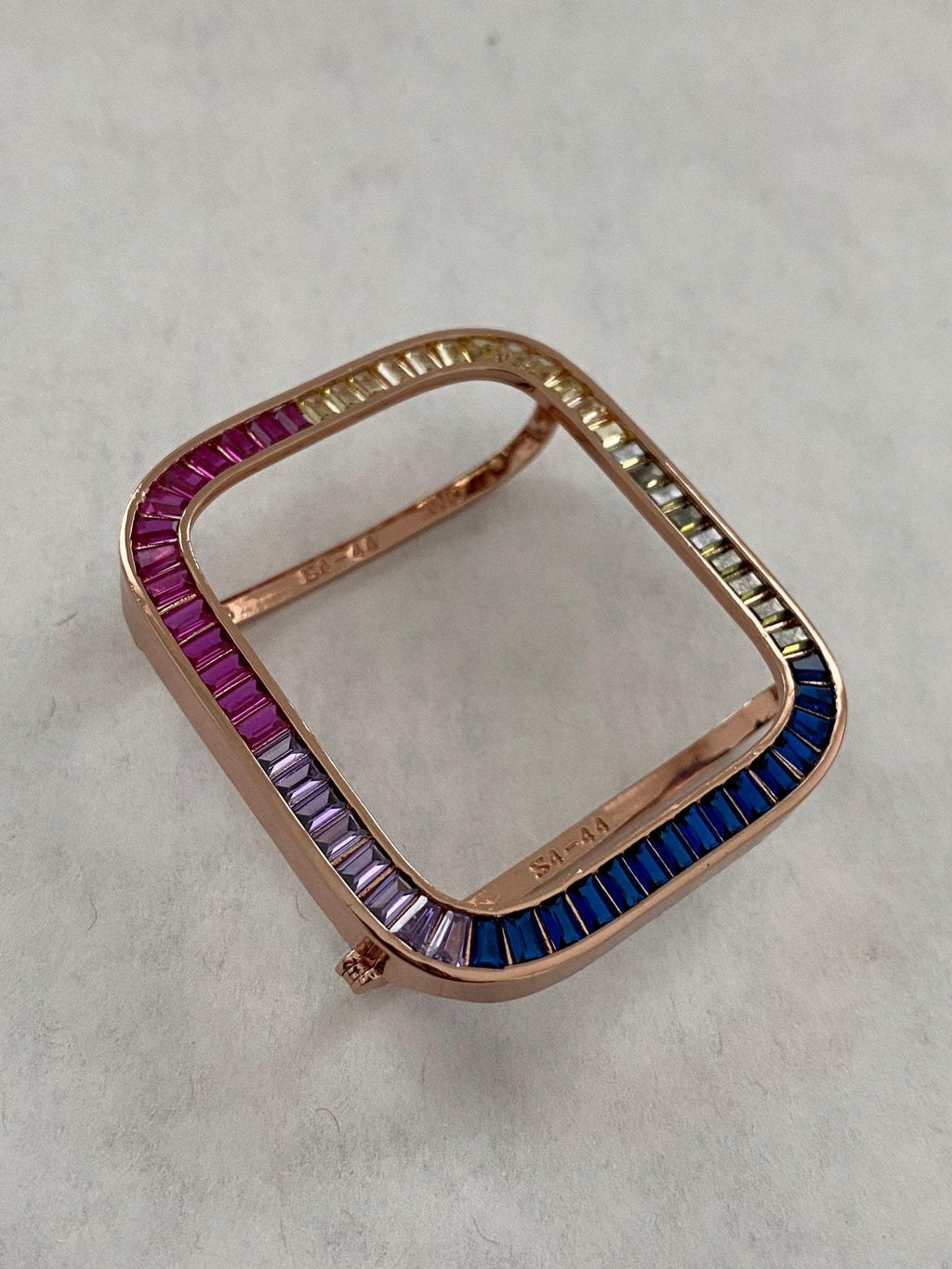 Introducing our stunning Apple Watch Case - designed specifically for the Apple Watch series 2-9 SE (38-45mm) in both men's and women's sizes. This case comes in a beautiful rose gold color, perfect for any style. The bezel is custom plated in 14k rose gold and adorned with high quality rainbow baguette lab diamonds.